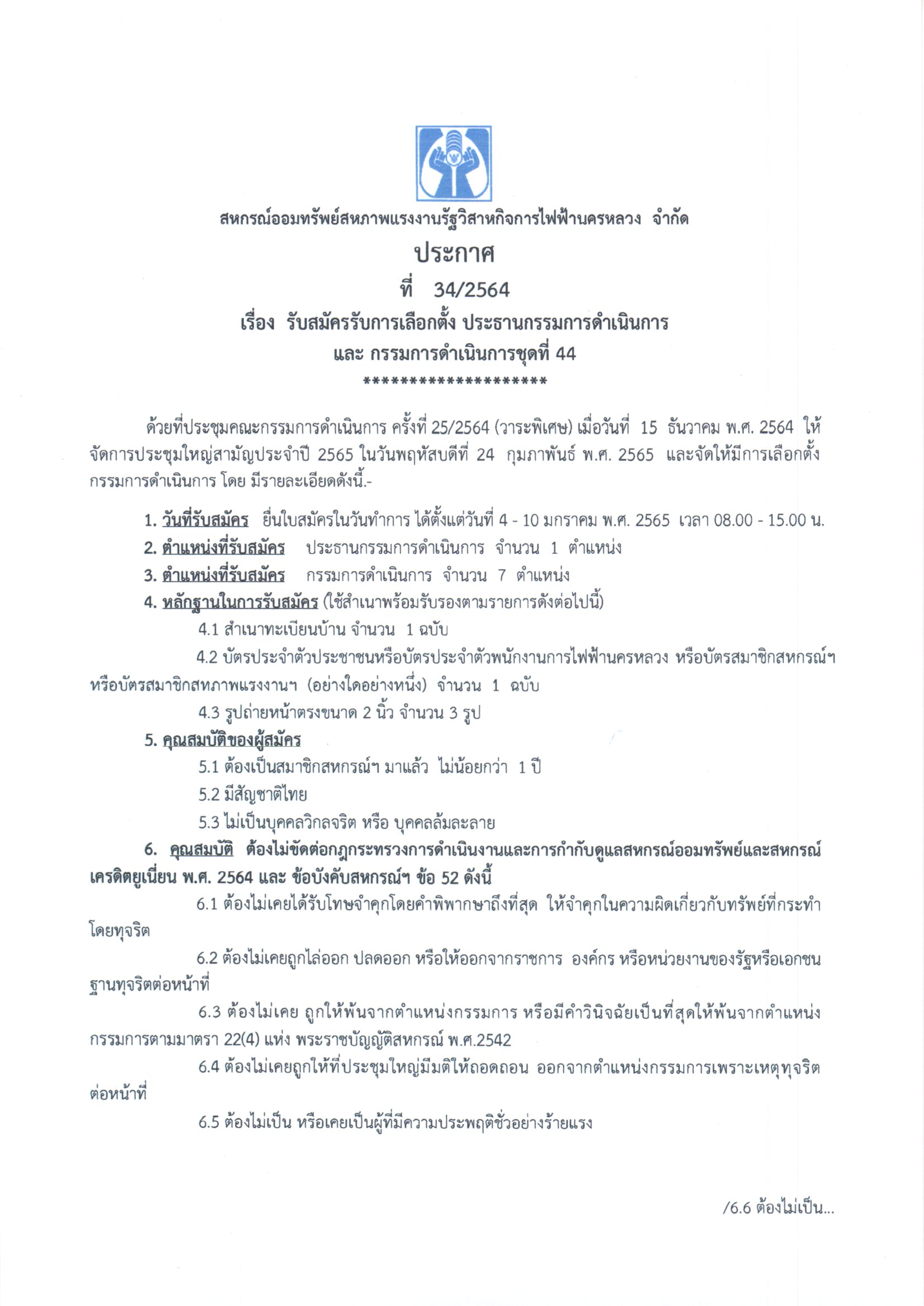 ประกาศที่ 34/2564 เรื่อง รับสมัครรับการเลือกตั้ง ประธานกรรมการดำเนินการ และกรรมการดำเนินการชุดที่ 44