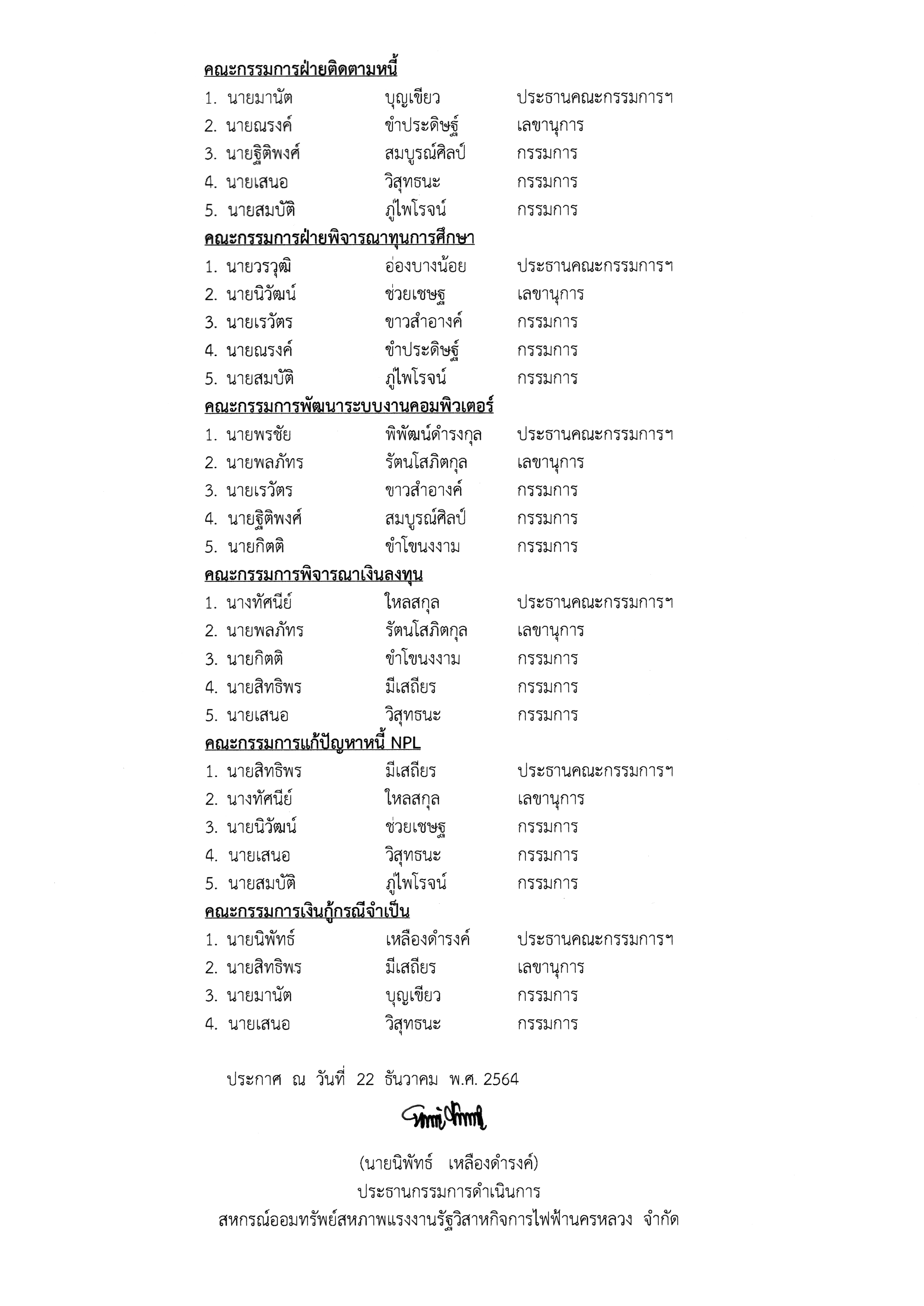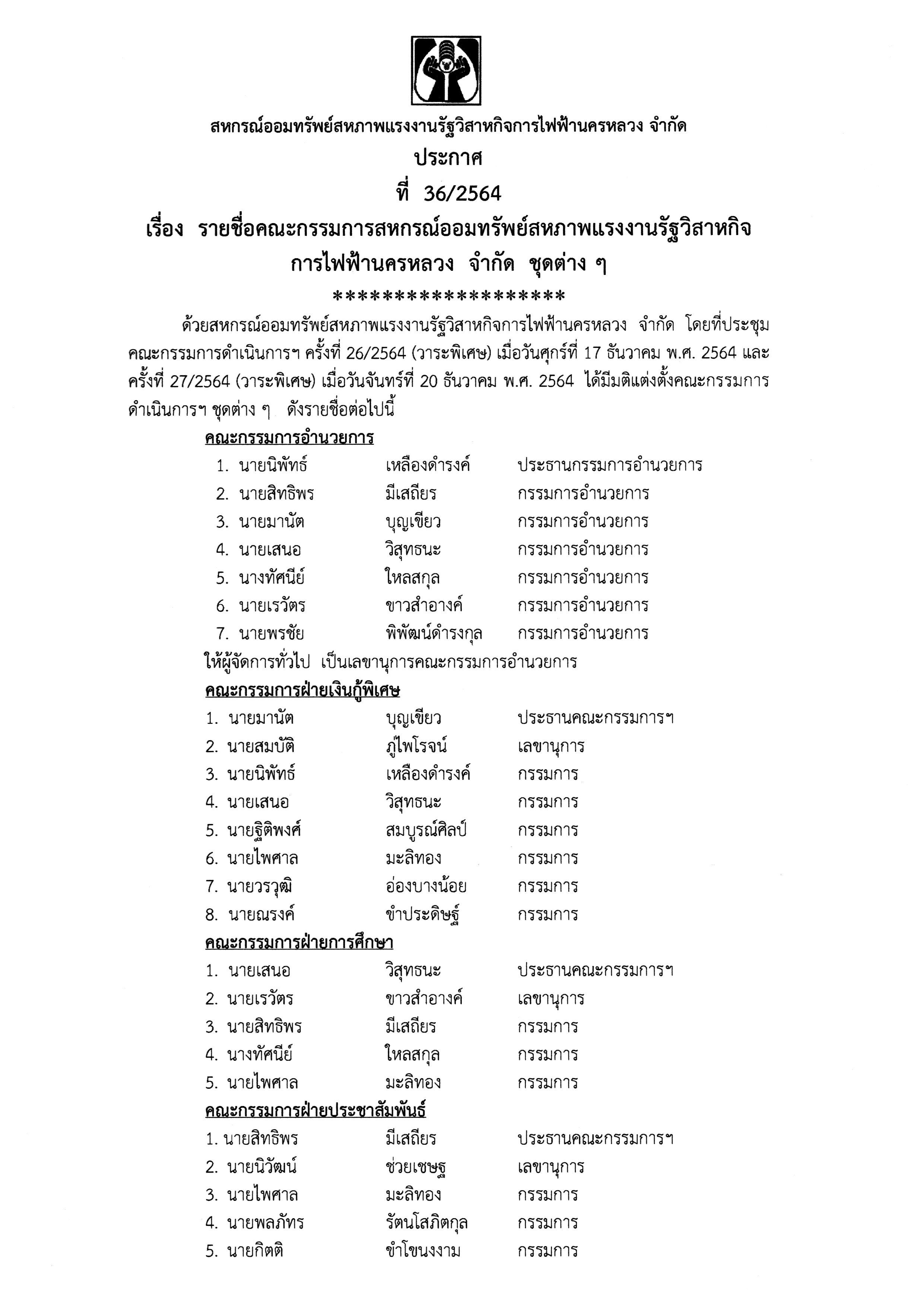 ประกาศที่ 36/2564 เรื่อง รายชื่อคณะกรรมการสหกรณ์ออมทรัพย์สหภาพแรงงานรัฐวิสาหกิจการไฟฟ้านครหลวง จำกัด ชุดต่าง ๆ