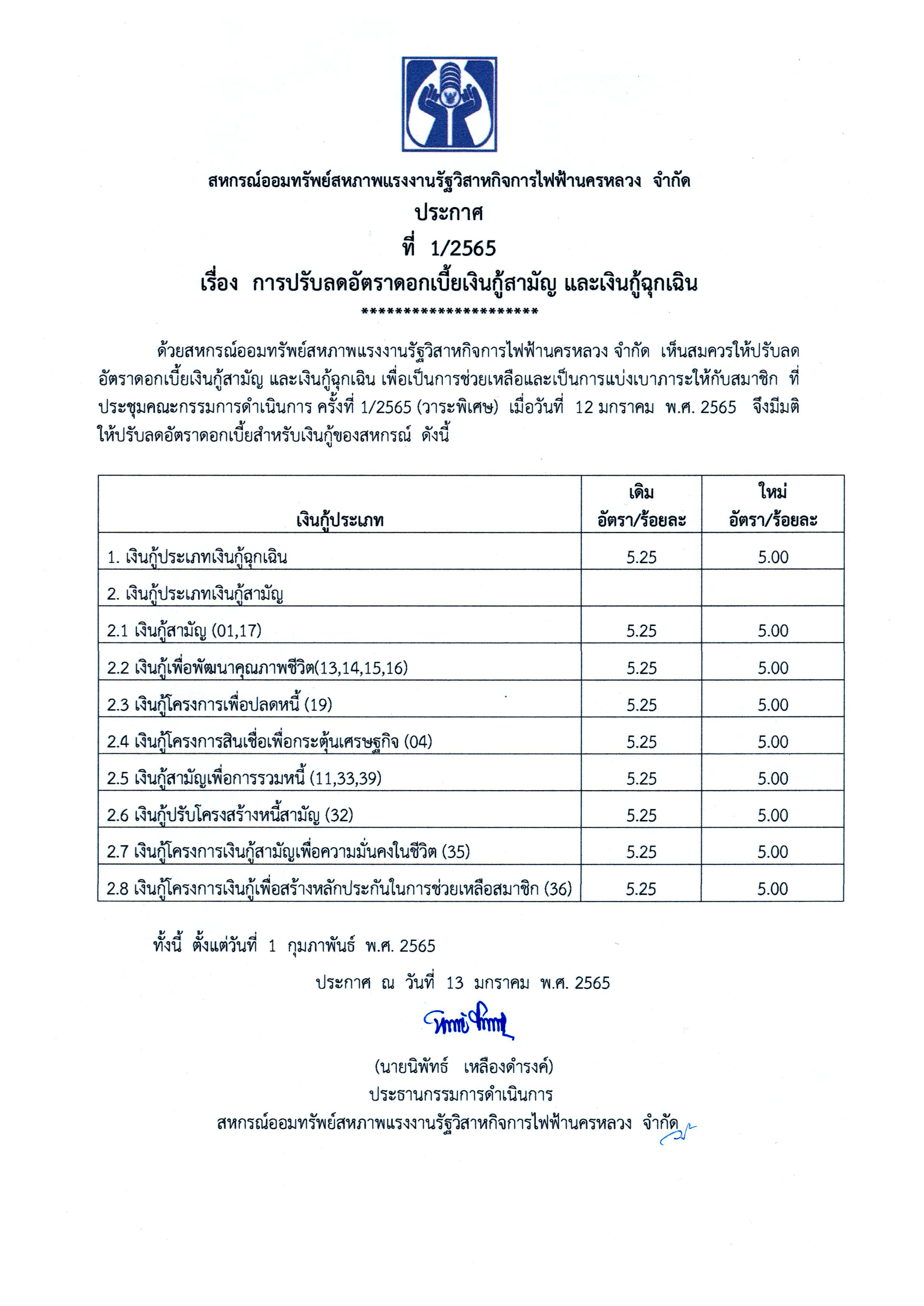 • ประกาศที่ 1/2565 เรื่อง การปรับลดอัตราดอกเบี้ยเงินกู้สามัญ และเงินกู้ฉุกเฉิน