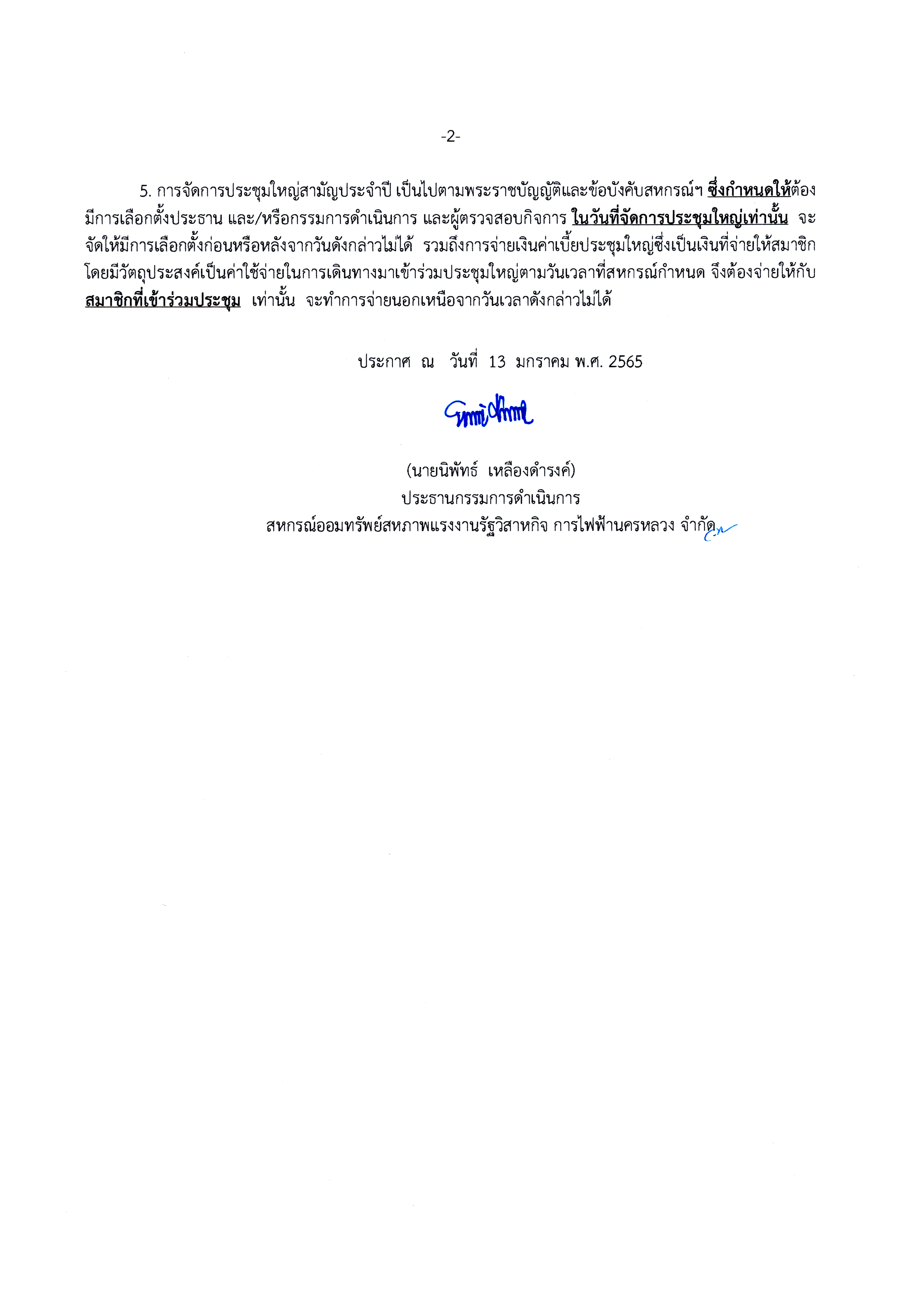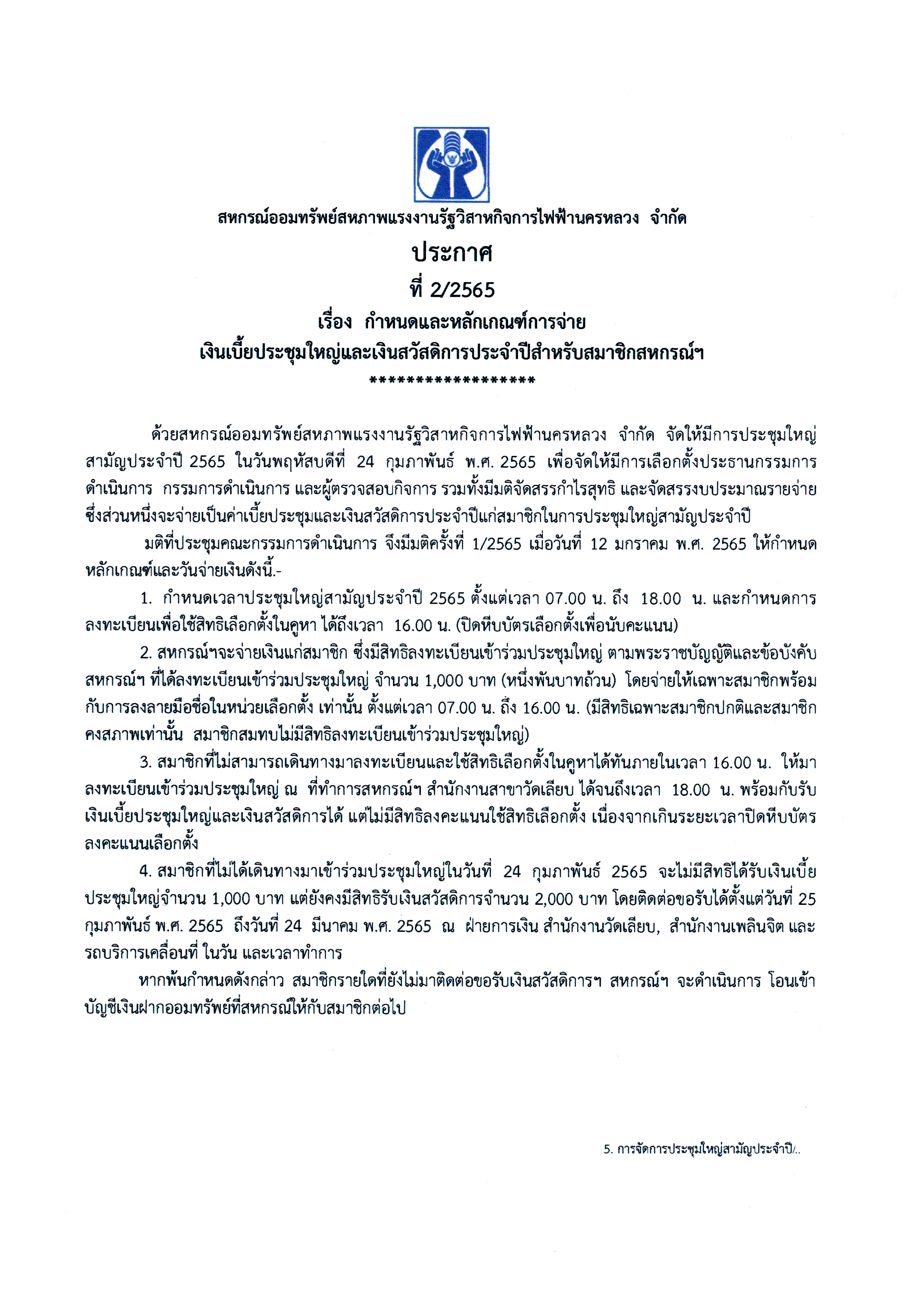 • ประกาศที่ 2/2565 เรื่อง กำหนดและหลักเกณฑ์การจ่ายเงินเบี้ยประชุมใหญ่และเงินสวัสดิการประจำปี