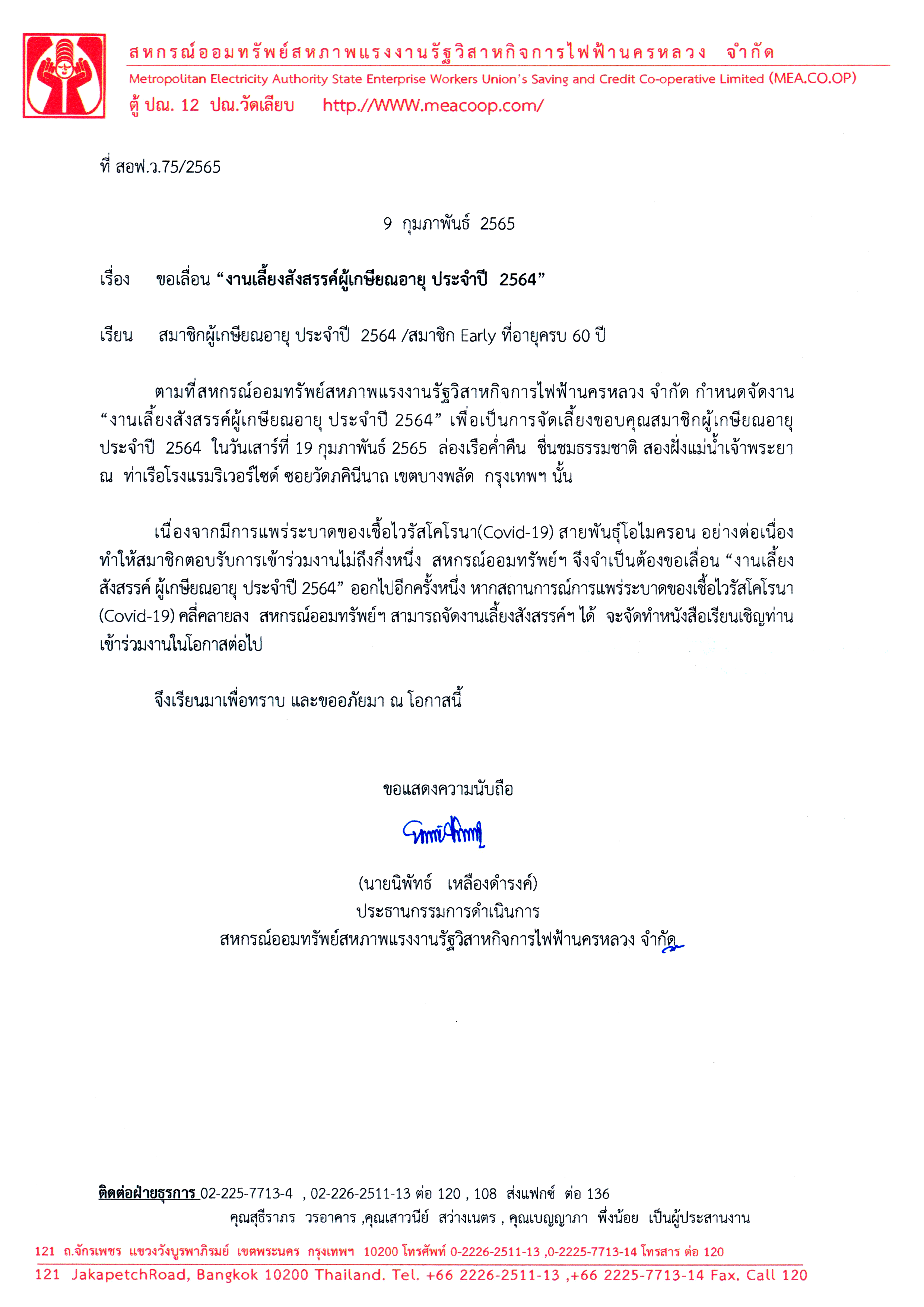 ประกาศที่ สอฟ.ว.75/2565 เรื่อง ขอเลื่อน "งานเลี้ยงสังสรรค์ผู้เกษียณอายุ ประจำปี 2564"