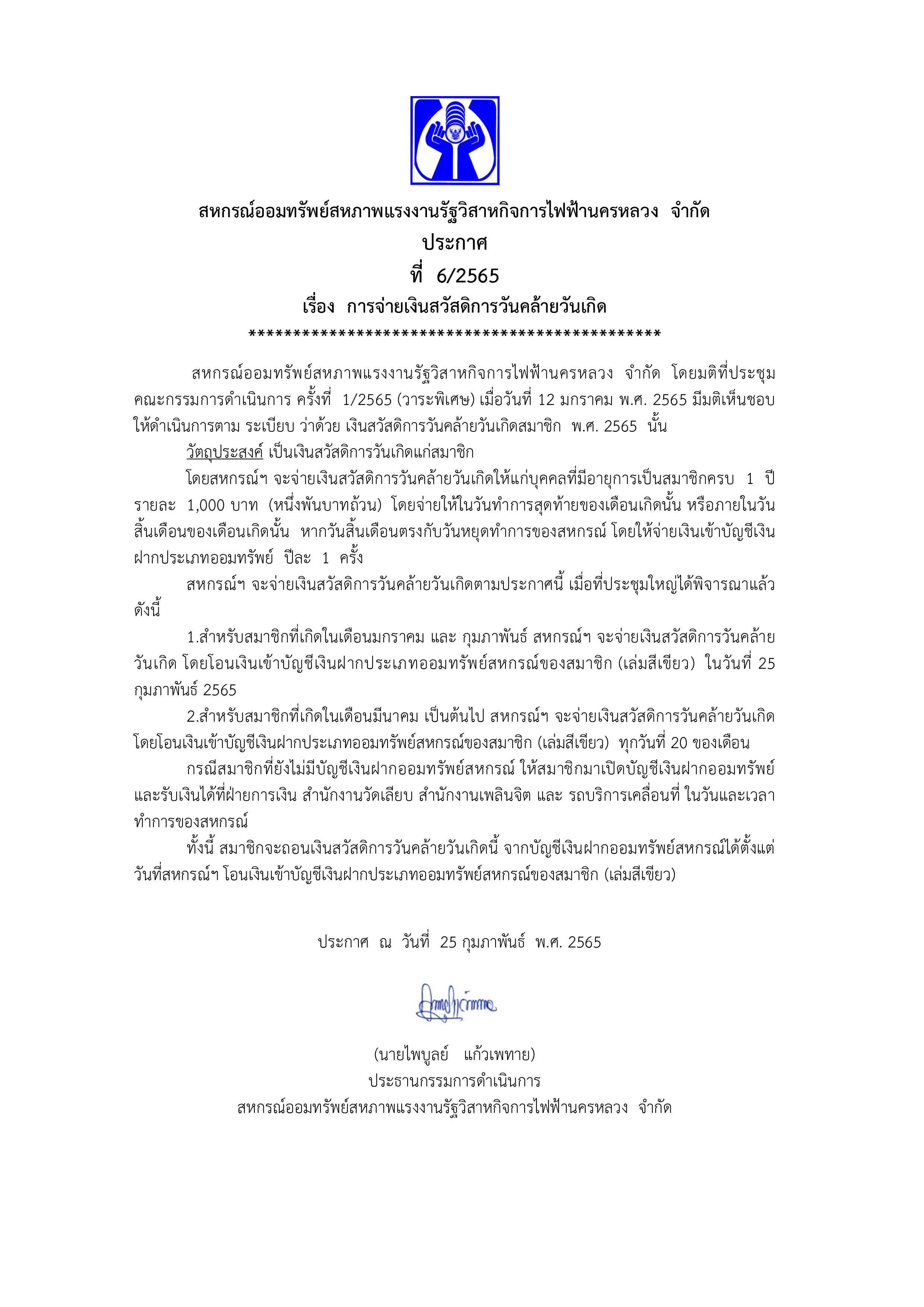 ประกาศที่ 6/2565 เรื่อง การจ่ายเงินสวัสดิการวันคล้ายวันเกิด
