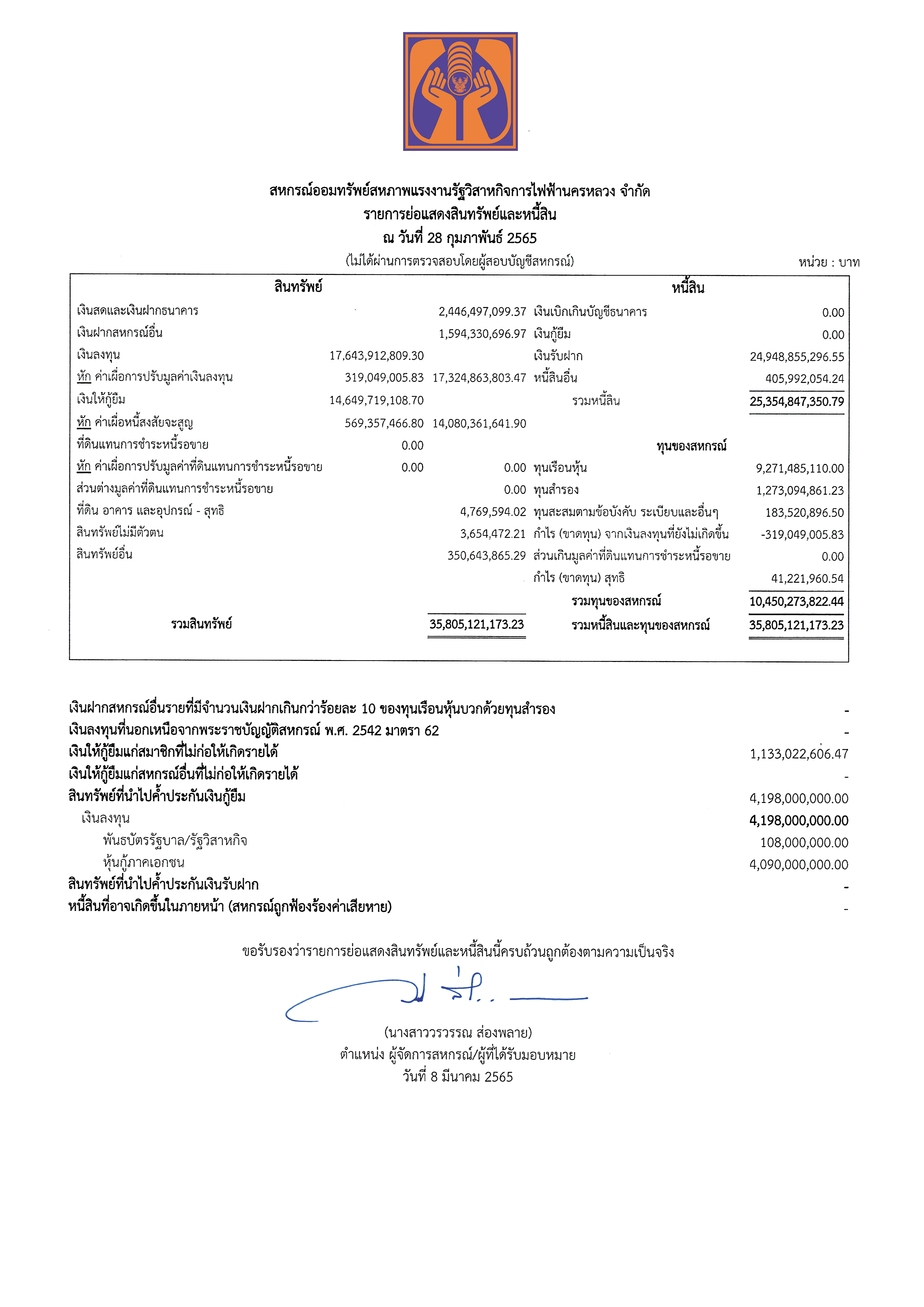 ประกาศรายการย่อแสดงสินทรัพย์และหนี้สิน ณ วันที่ 28 กุมภาพันธ์ 2565