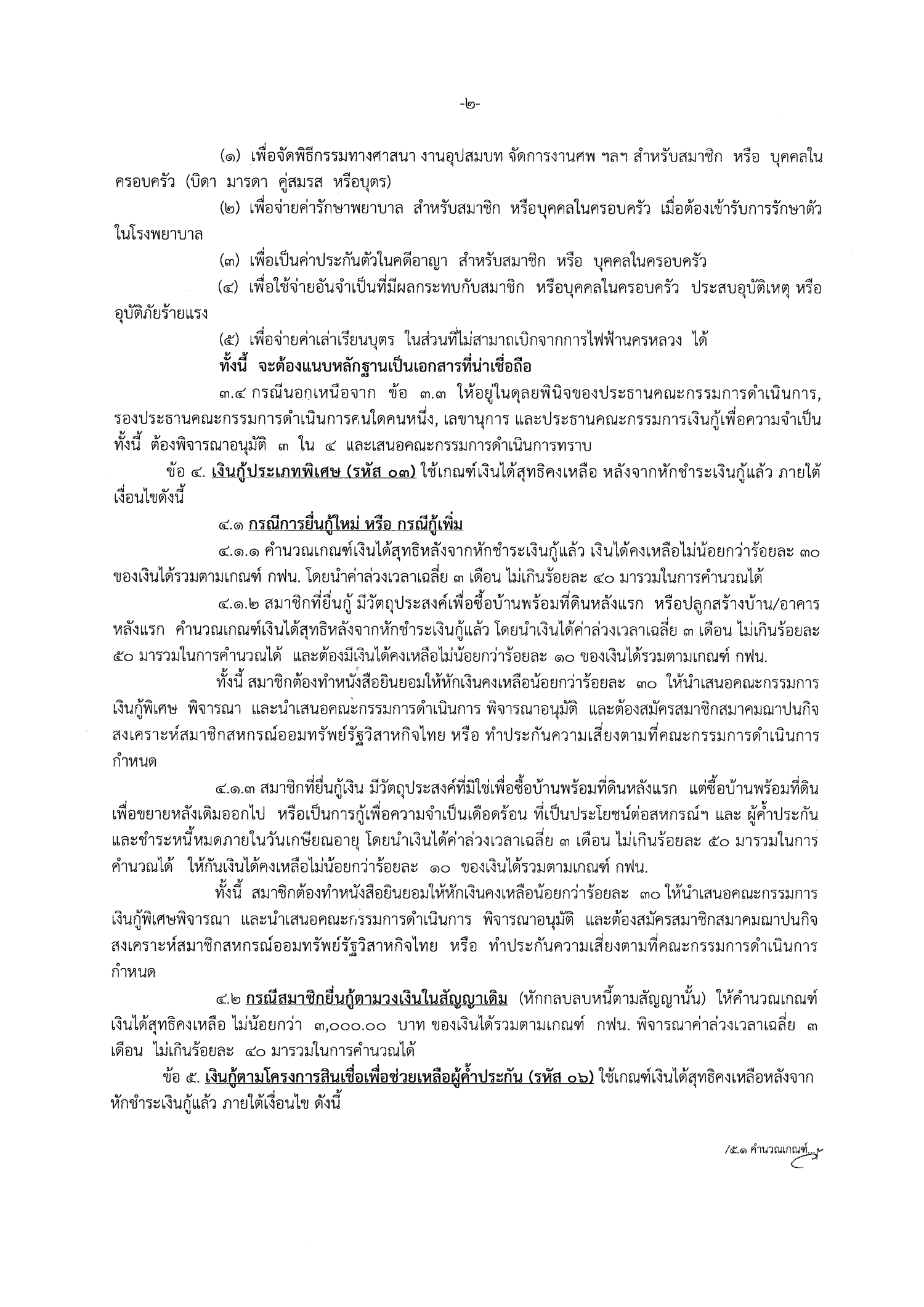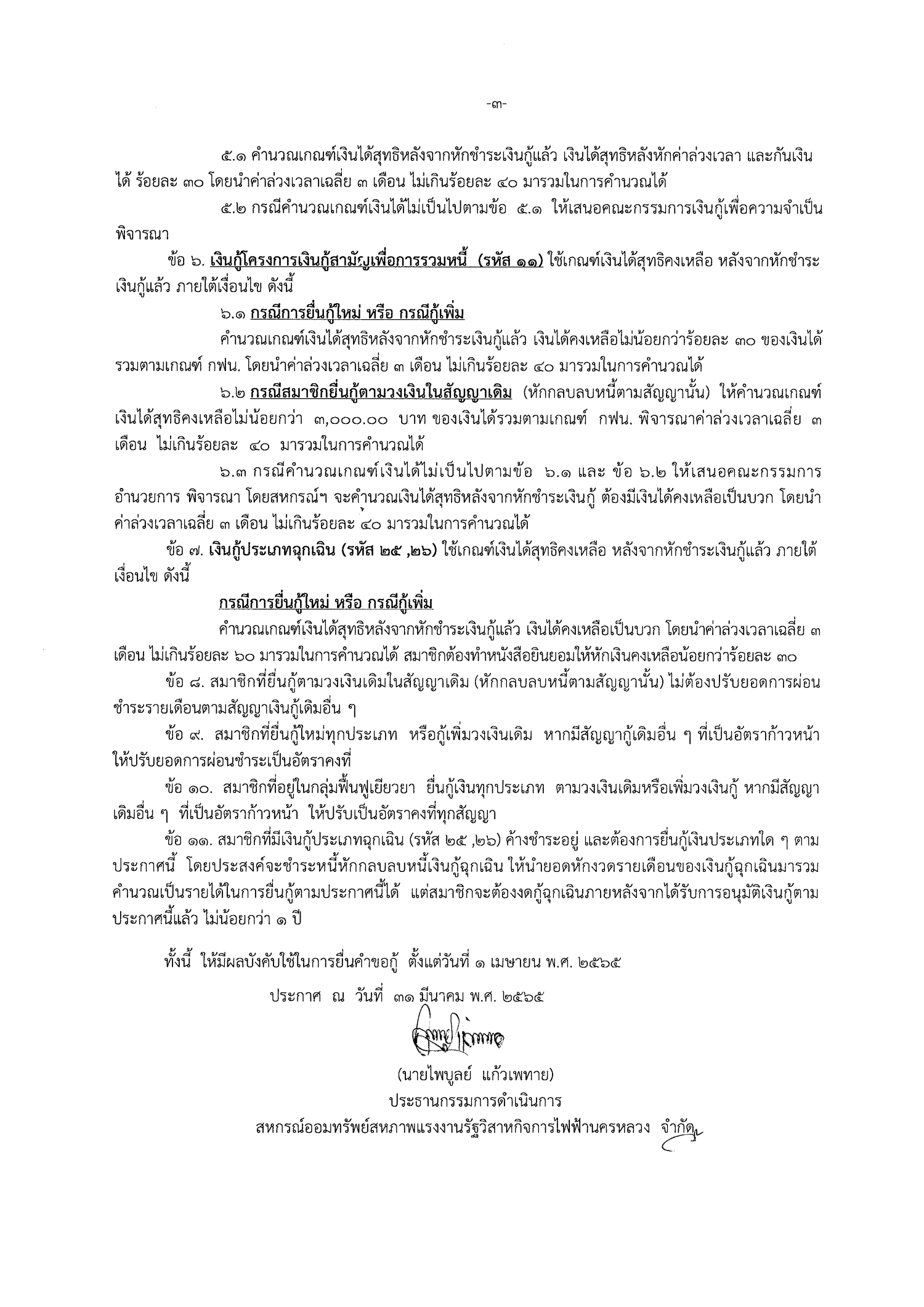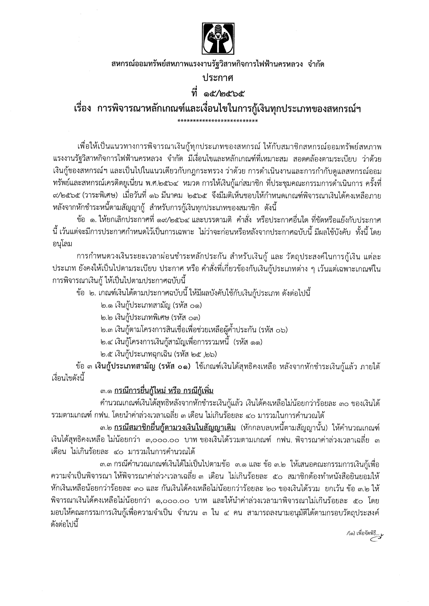 • ประกาศที่ 15/2565 เรื่อง การพิจารณาหลักเกณฑ์และเงื่อนไขในการกู้เงินทุกประเภทของสหกรณ์ฯ