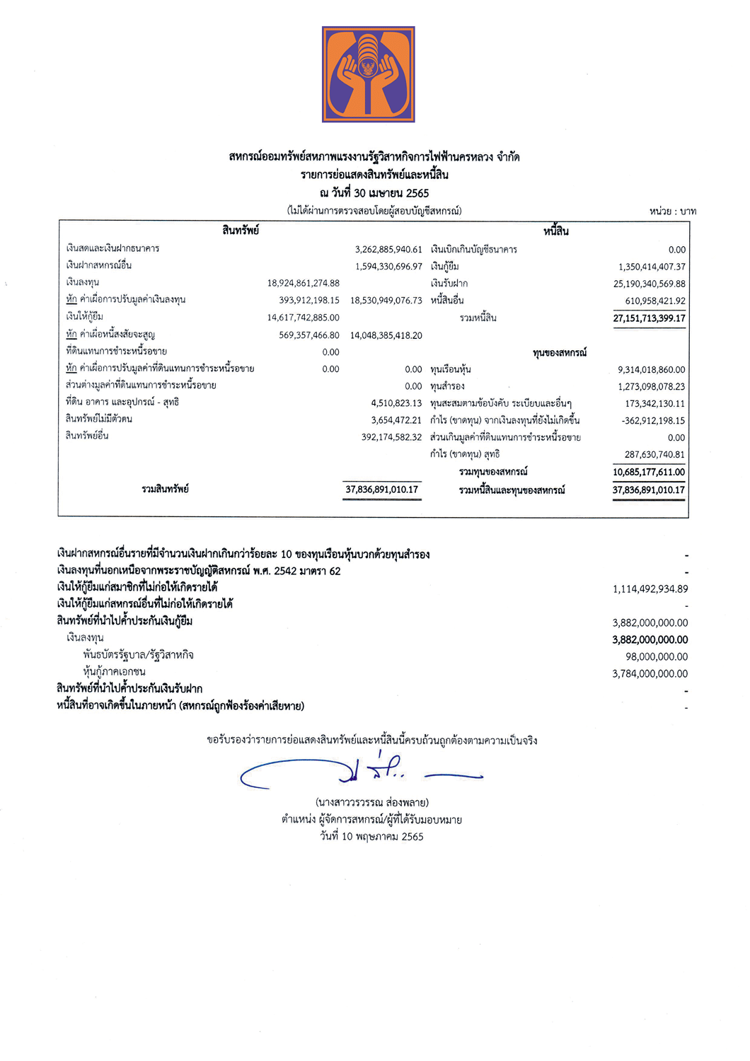 ประกาศรายการย่อแสดงสินทรัพย์และหนี้สิน ณ วันที่ 30 เมษายน 2565