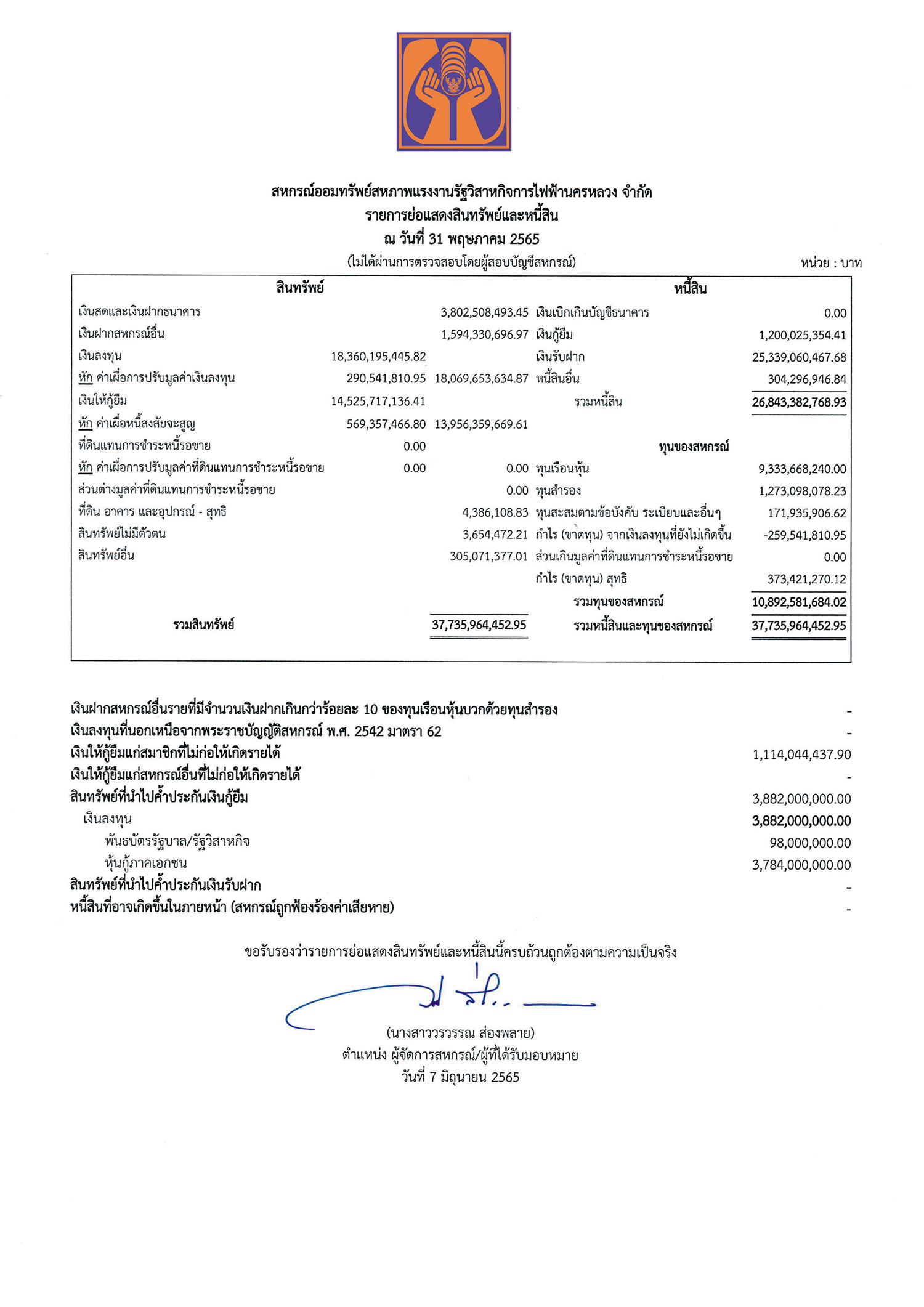 ประกาศรายการย่อแสดงสินทรัพย์และหนี้สิน ณ วันที่ 31 พฤษภาคม 2565