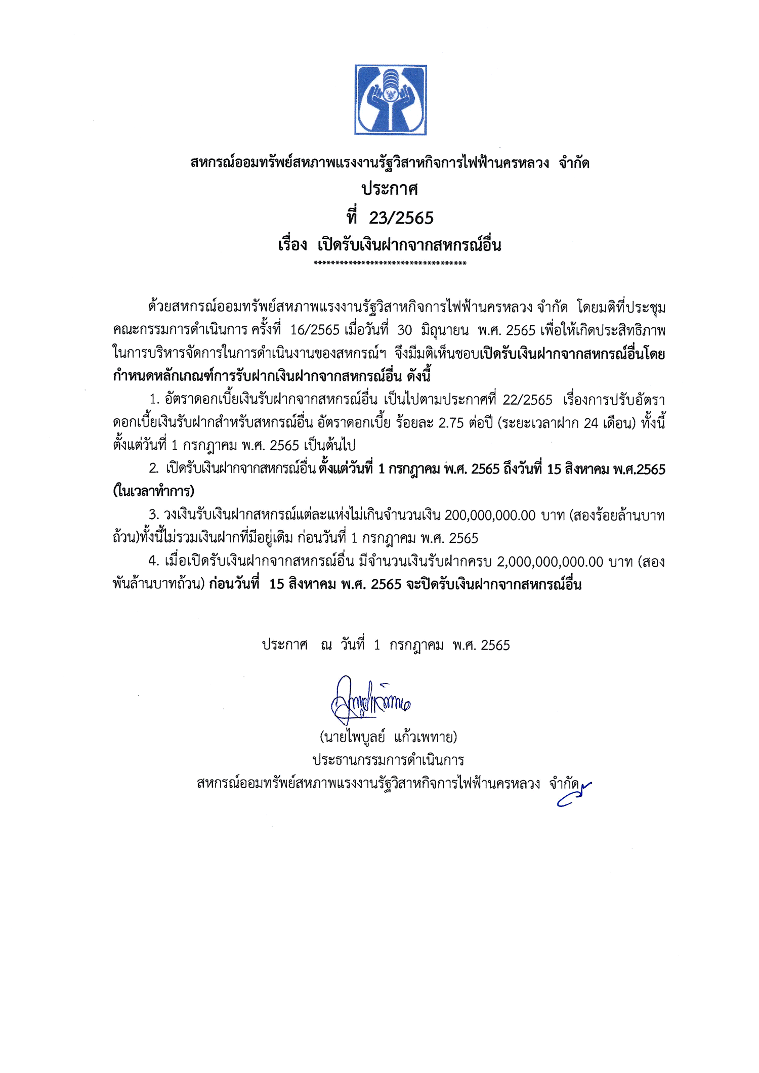 ประกาศที่ 23/2565 เรื่อง เปิดรับเงินฝากจากสหกรณ์อื่น