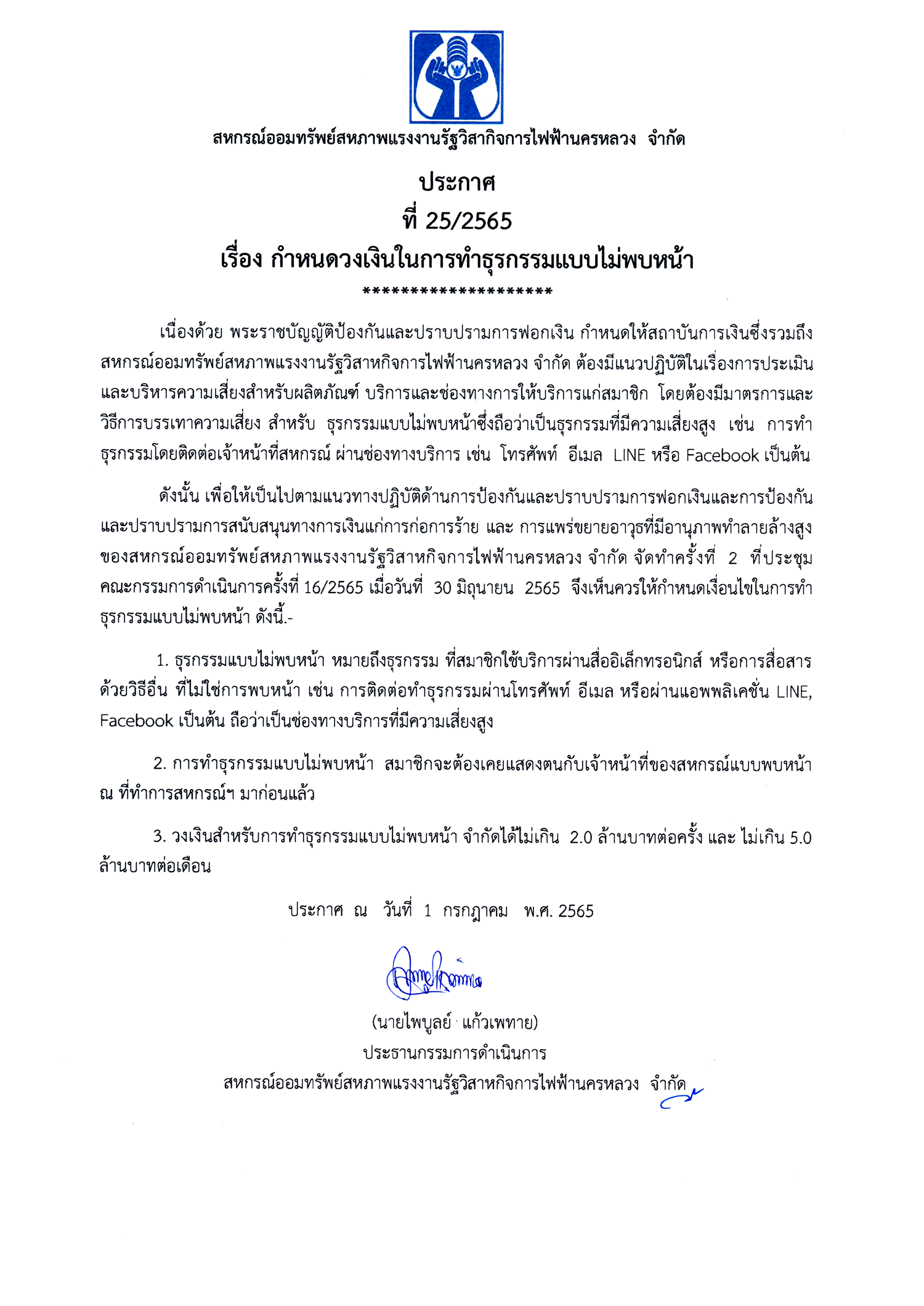 • ประกาศที่ 25/2565 เรื่อง กำหนดวงเงินในการทำธุรกรรมแบบไม่พบหน้า