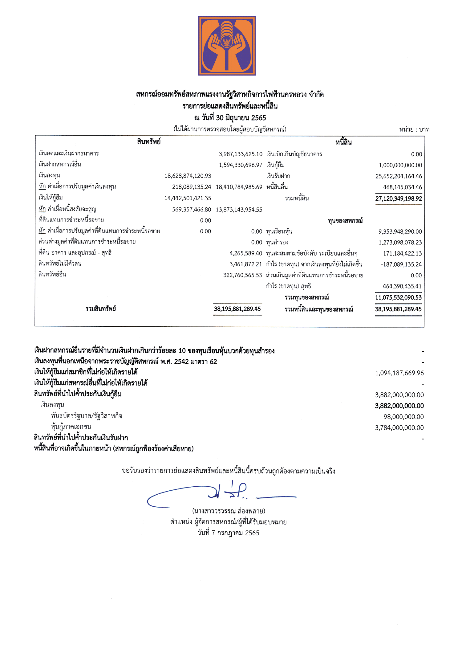 ประกาศรายการย่อแสดงสินทรัพย์และหนี้สิน ณ วันที่ 30 มิถุนายน 2565