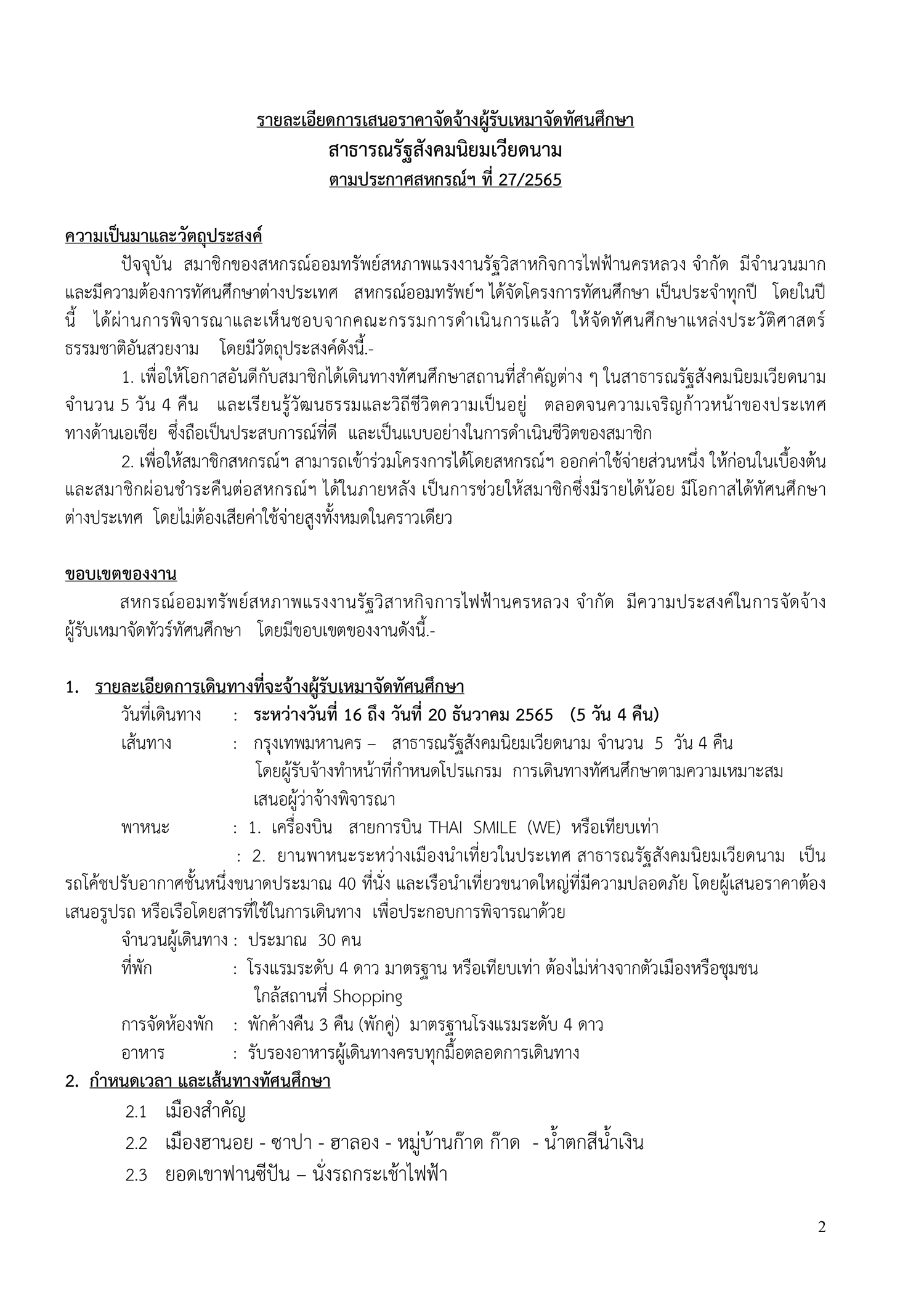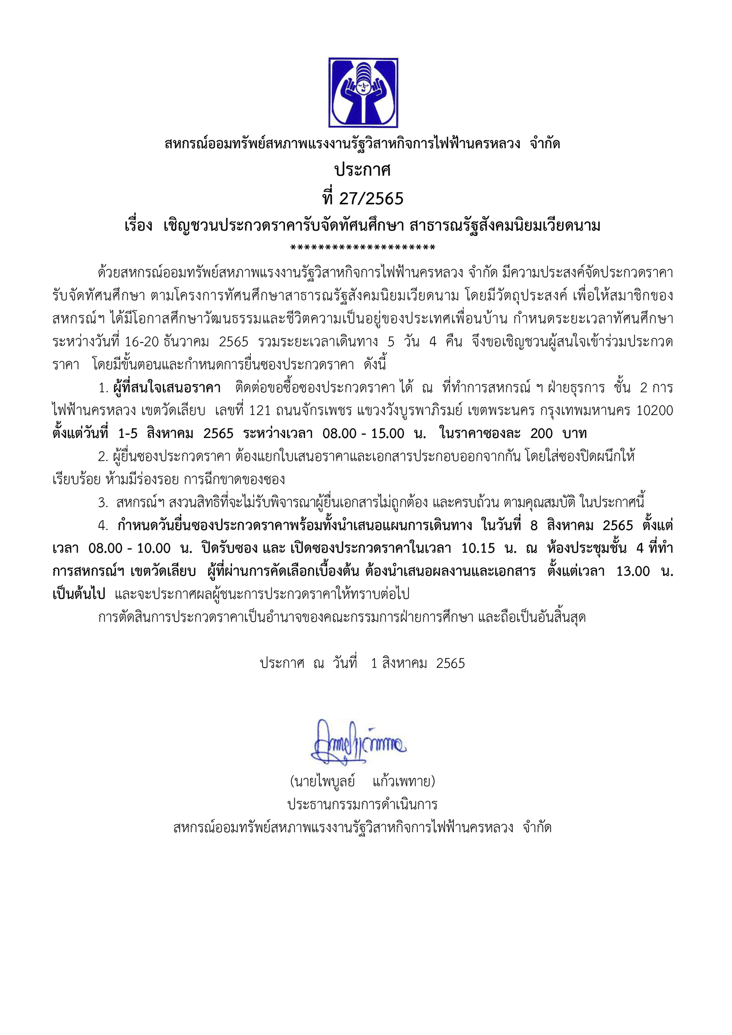 ประกาศที่ 27/2565 เรื่อง เชิญชวนประกวดราคารับจัดทัศนศึกษา สาธารณรัฐสังคมนิยมเวียดนาม