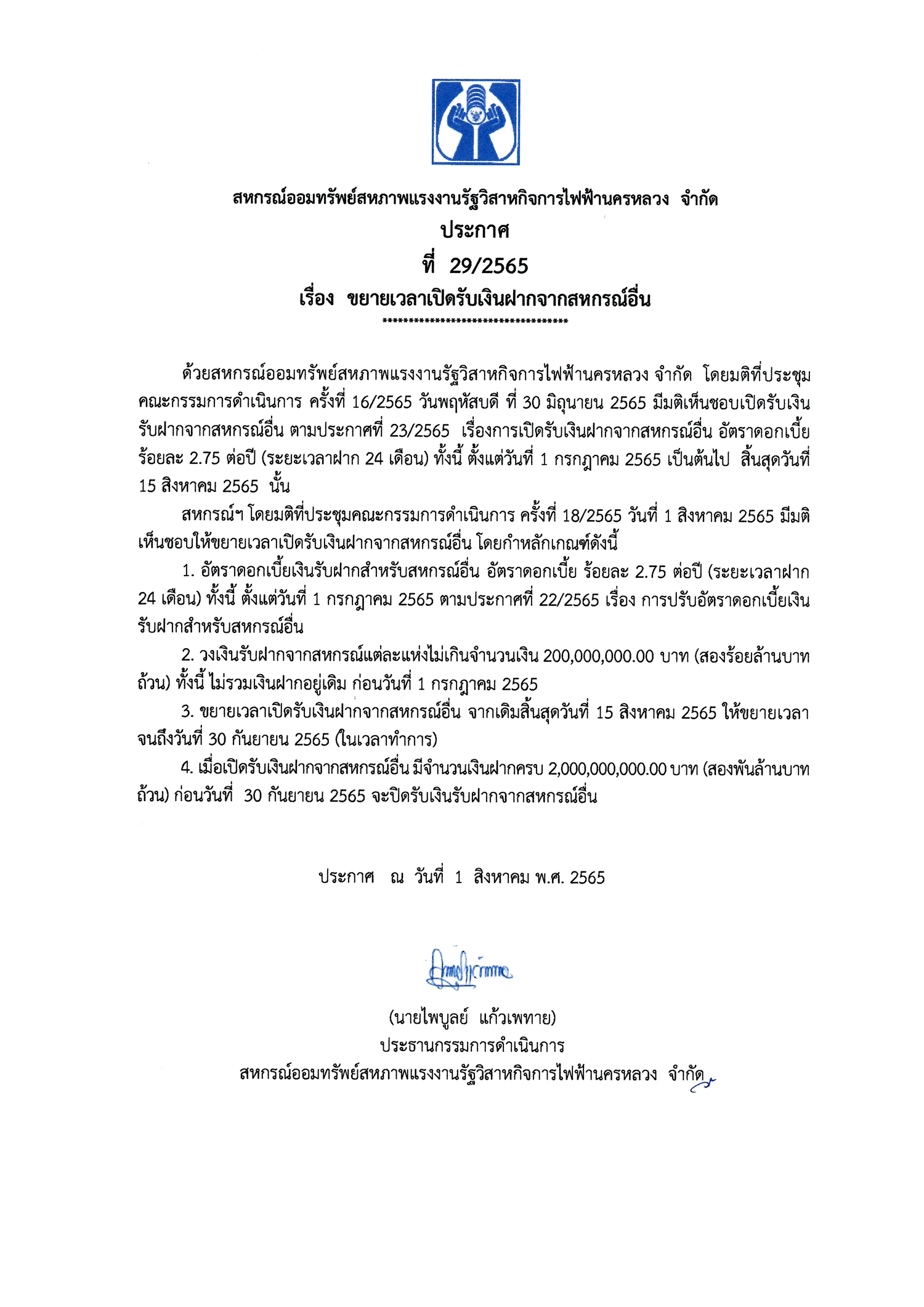 ประกาศที่ 29/2565 เรื่อง ขยายเวลาเปิดรับเงินฝากจากสหกรณ์อื่น