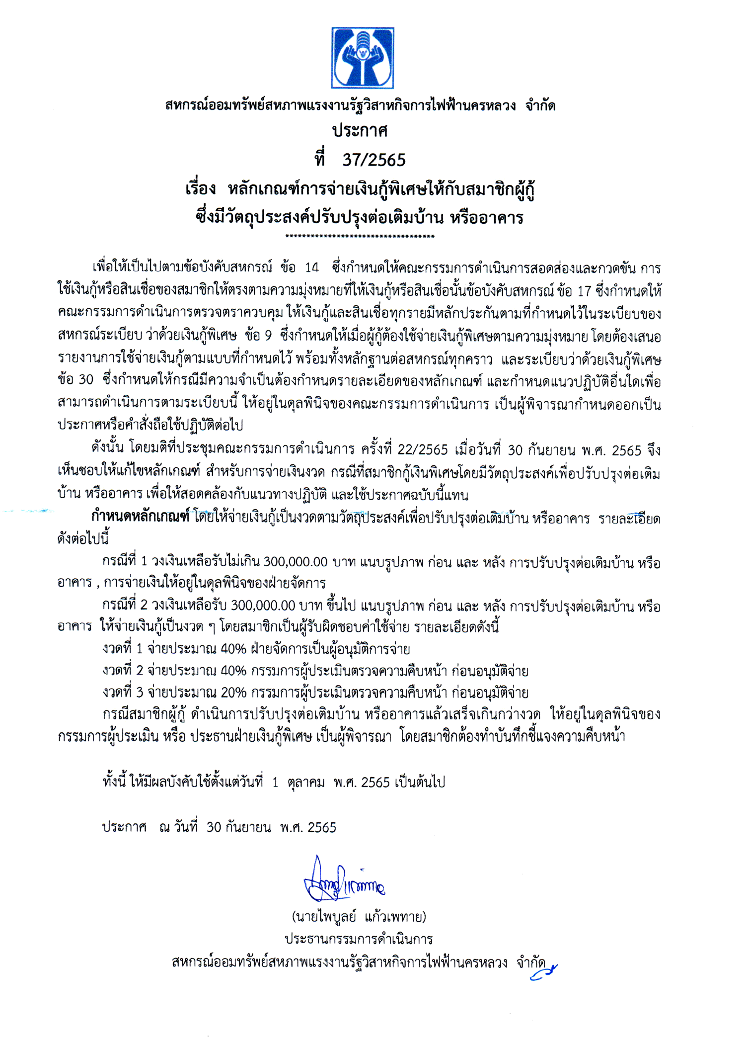 • ประกาศที่ 37/2565 เรื่อง หลักเกณฑ์การจ่ายเงินกู้พิเศษให้กับสมาชิกผู้กู้ซึ่งมีวัตถุประสงค์ปรับปรุงต่อเติมบ้าน อาคาร