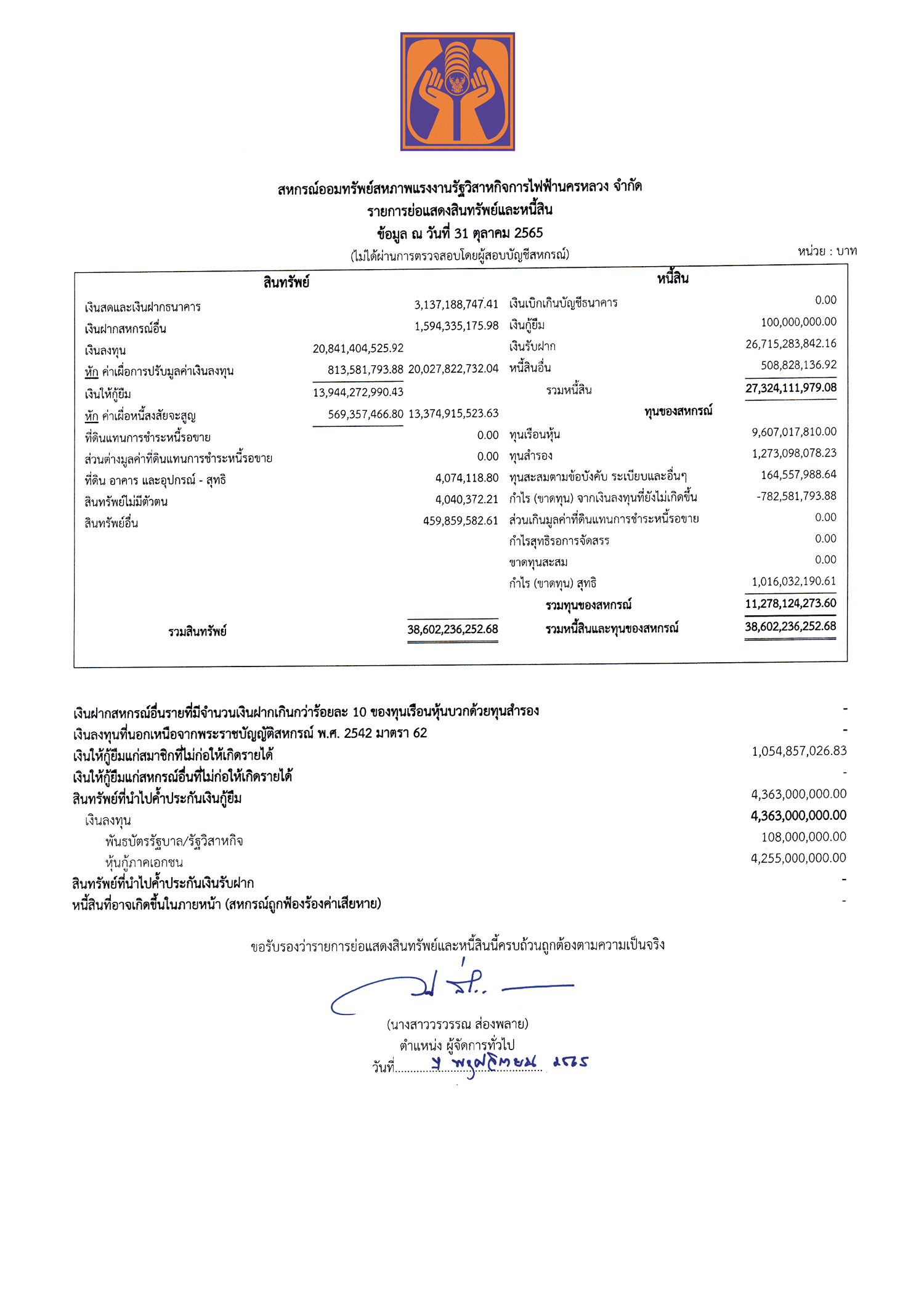 • ประกาศรายการย่อแสดงสินทรัพย์และหนี้สิน ณ วันที่ 31 ตุลาคม 2565