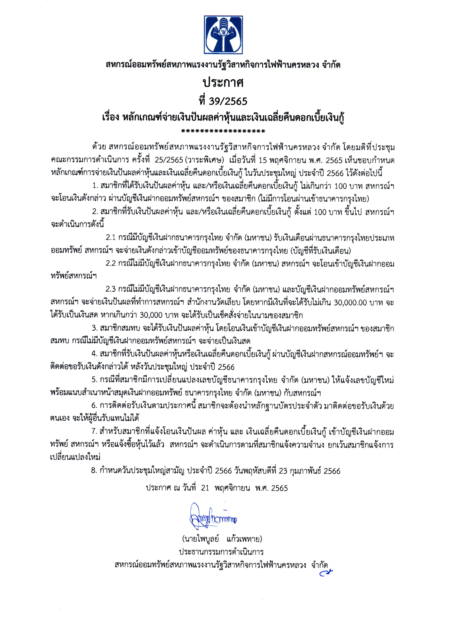 ประกาศที่ 39/2565 เรื่อง หลักเกณฑ์จ่ายเงินปันผลค่าหุ้นและเงินเฉลี่ยคืนดอกเบี้ยเงินกู้
