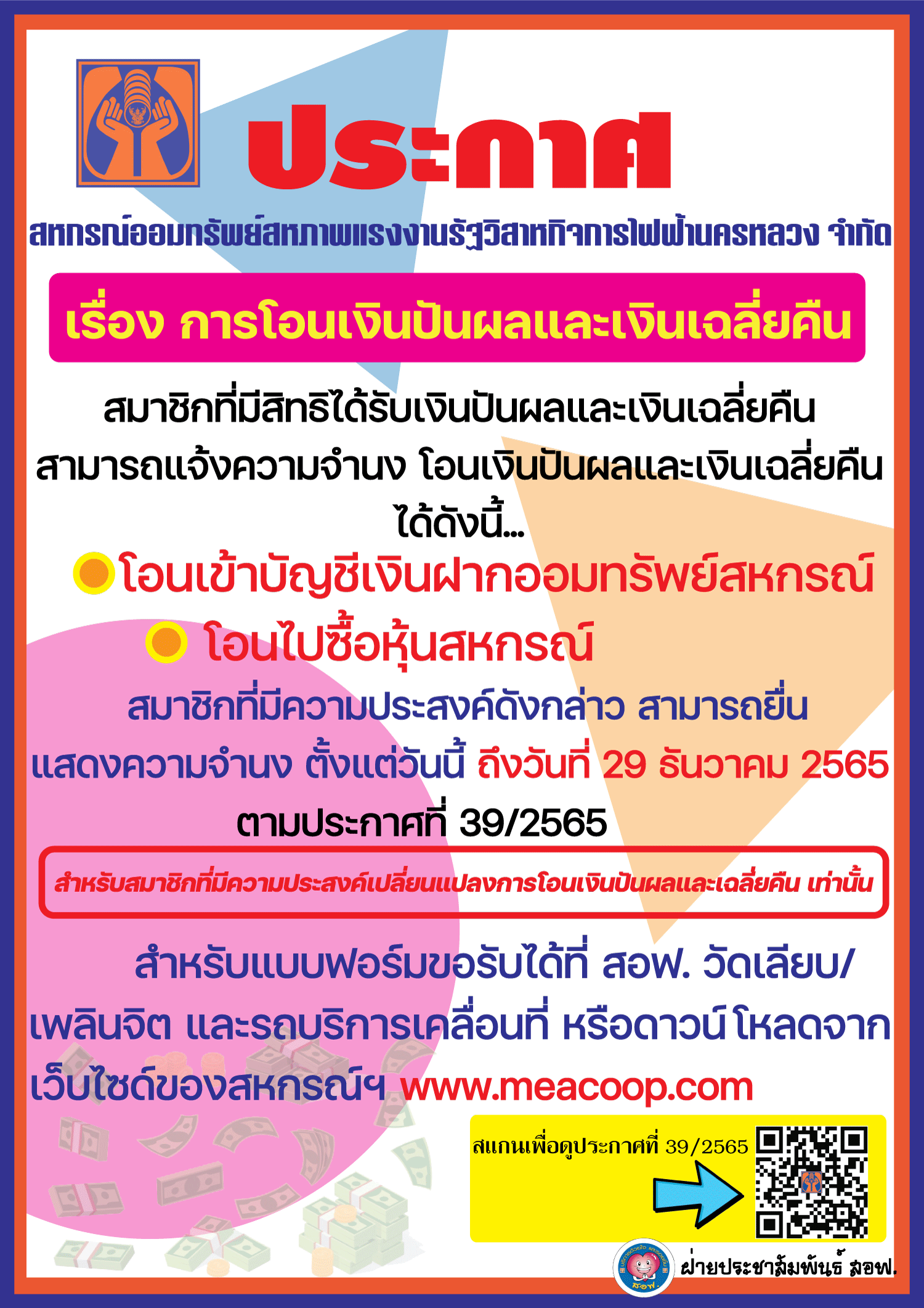 • ประกาศ เรื่อง การโอนเงินปันผลและเงินเฉลี่ยคืน