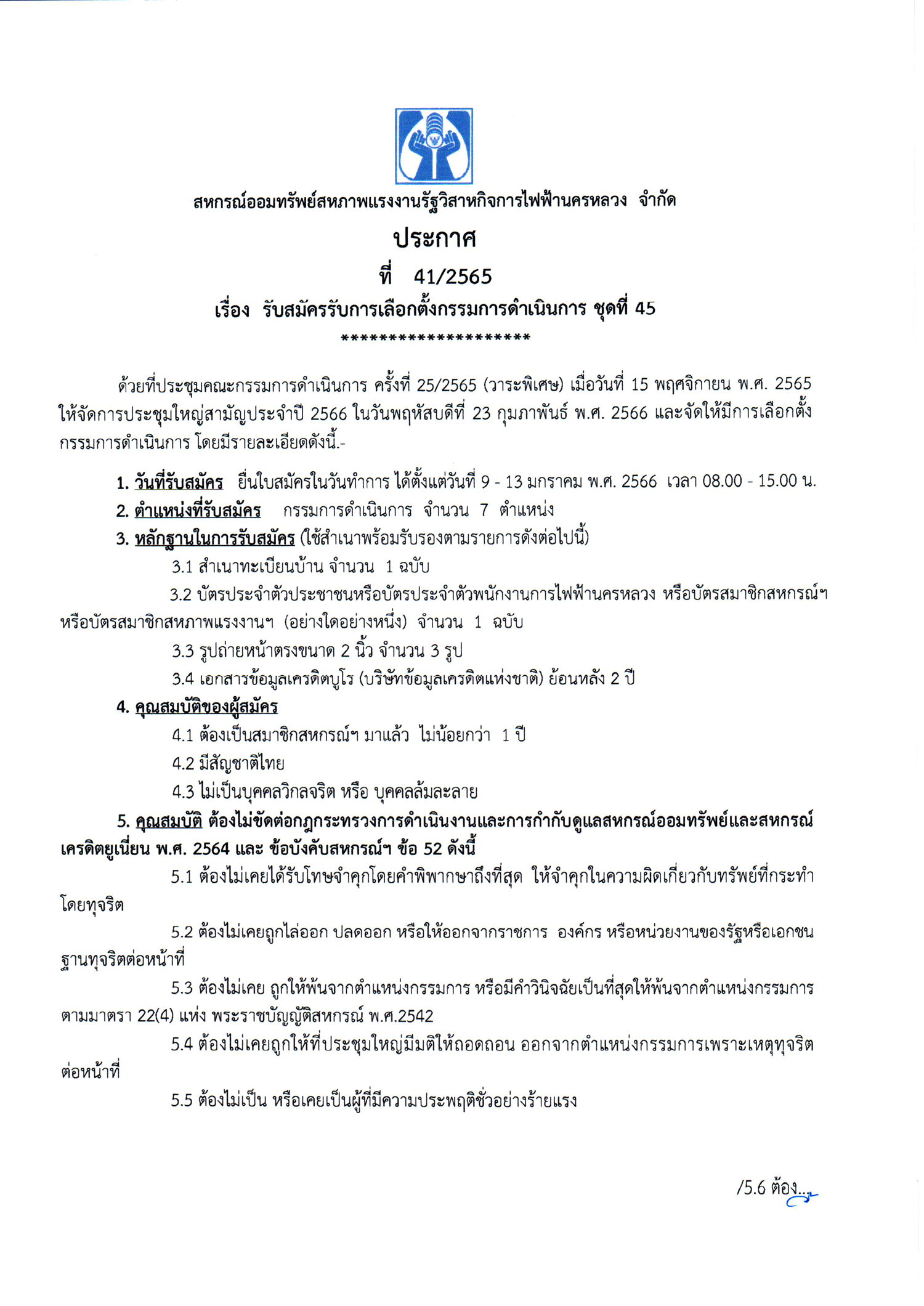 ประกาศที่ 41/2565 เรื่อง การรับสมัครรับการเลือกตั้งกรรมการดำเนินการ ชุดที่ 45