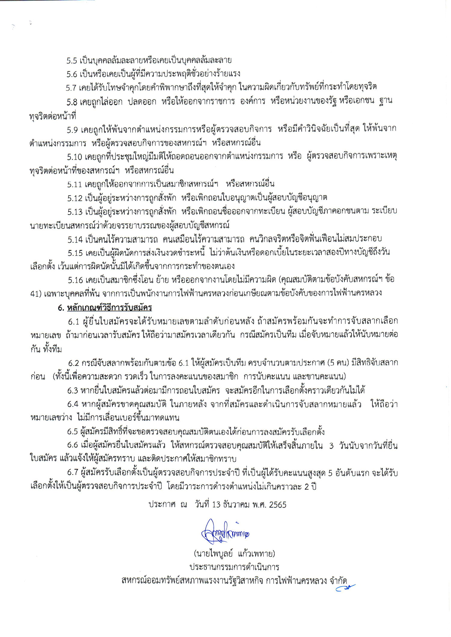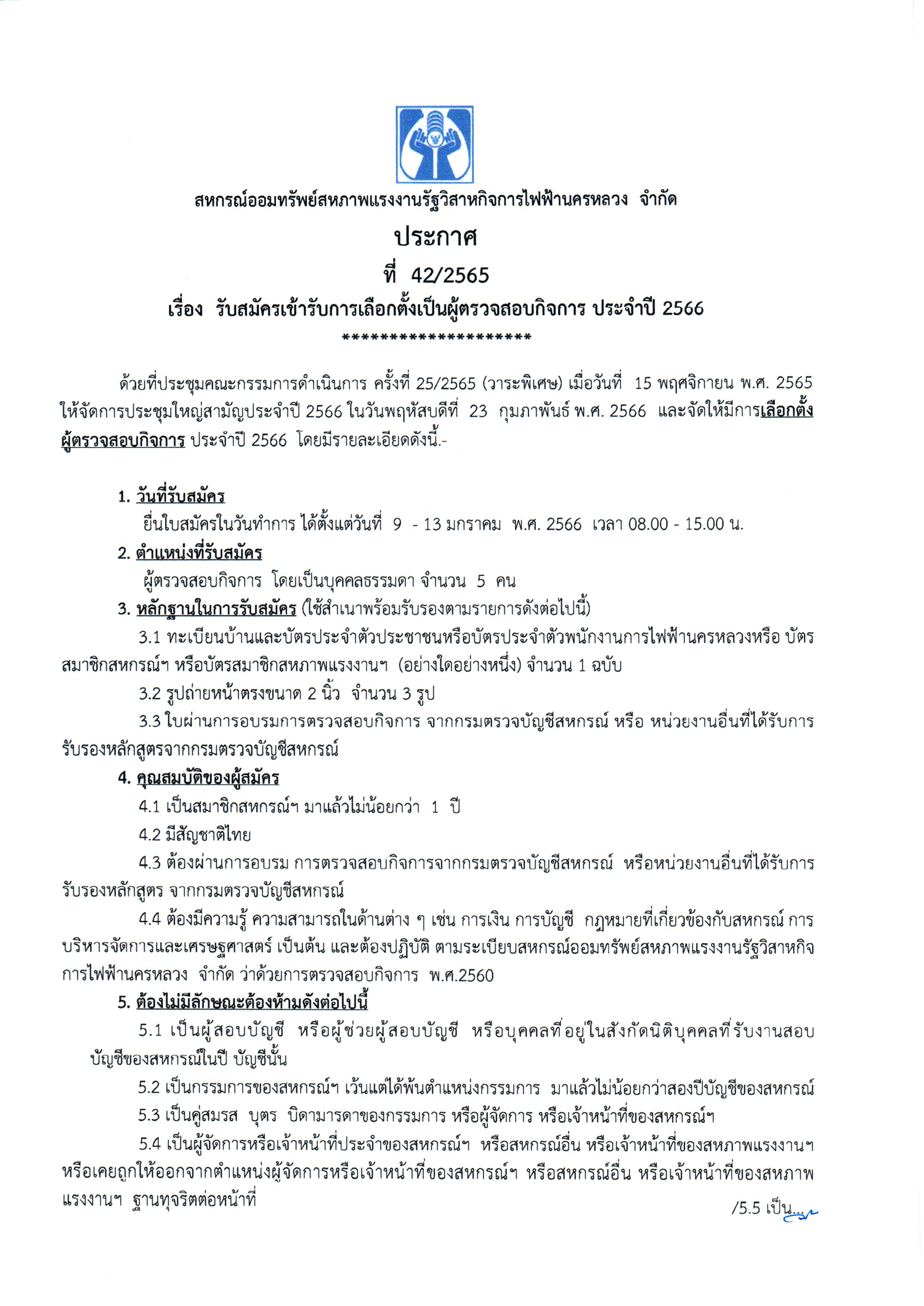 • ประกาศที่ 42/2565 เรื่อง การรับสมัครเข้ารับการเลือกตั้งเป็นผู้ตรวจสอบกิจการ ประจำปี 2566