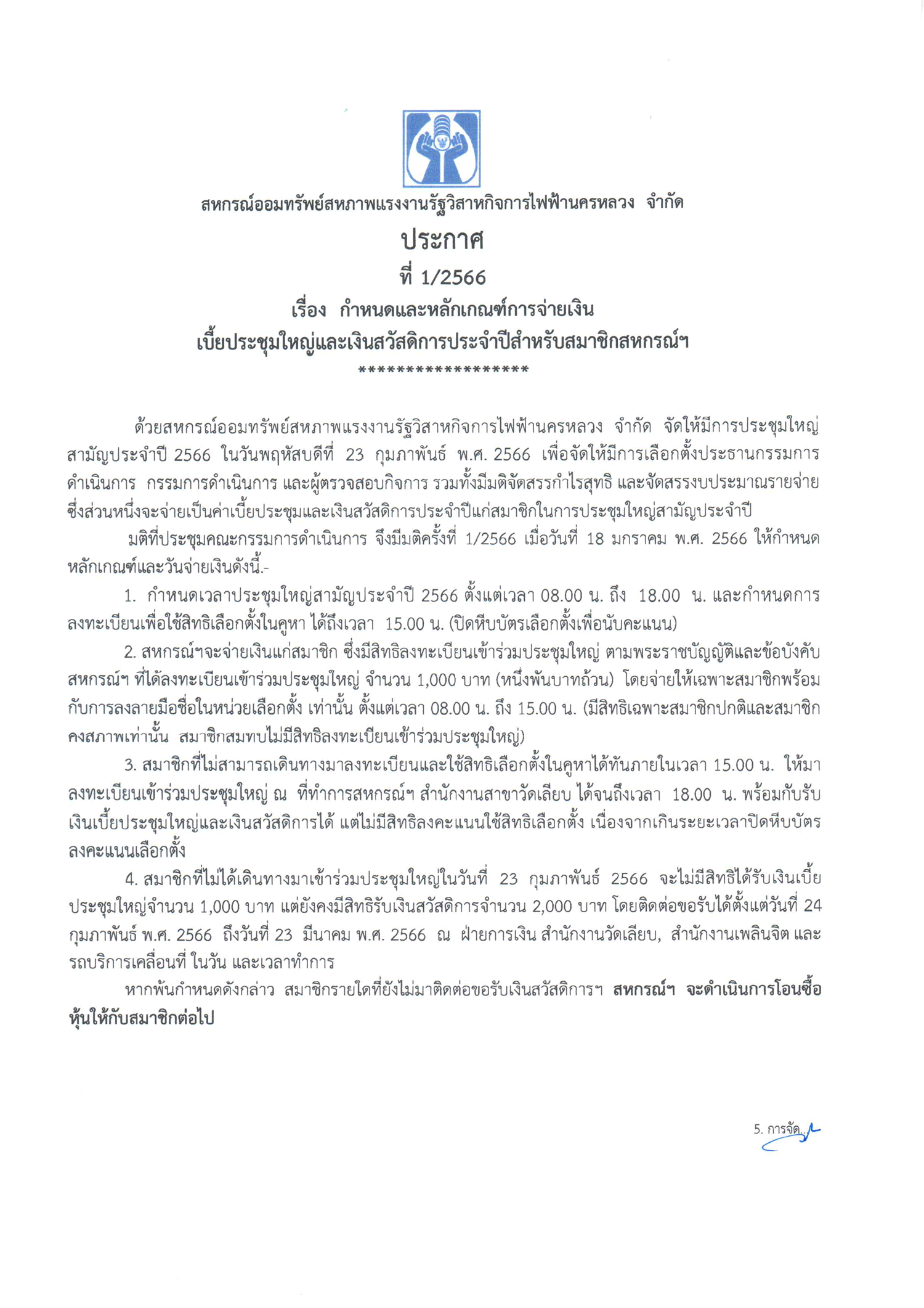 ประกาศที่ 1/2566 เรื่อง กำหนดหลักเกณฑ์การจ่ายเงินเบี้ยประชุมใหญ่และเงินสวัสดิการประจำปีสำหรับสมาชิกสหกรณ์