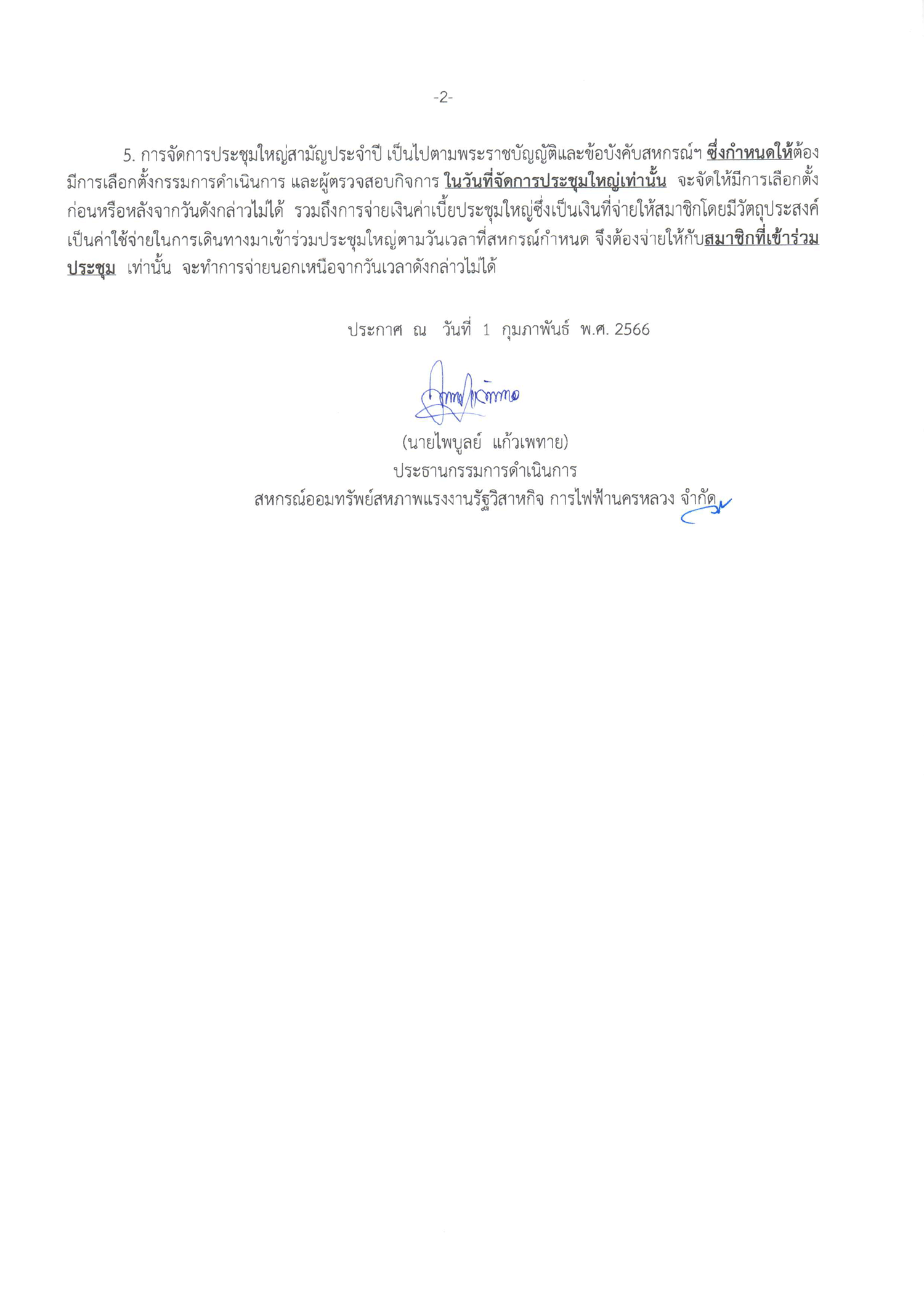 • ประกาศที่ 1/2566 เรื่อง กำหนดหลักเกณฑ์การจ่ายเงินเบี้ยประชุมใหญ่และเงินสวัสดิการประจำปีสำหรับสมาชิกสหกรณ์