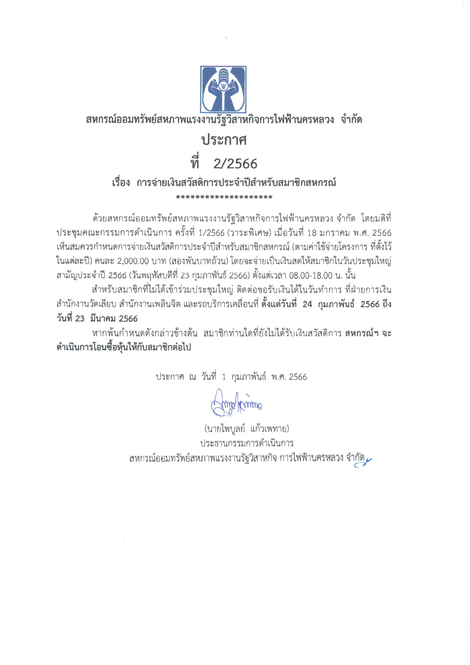 • ประกาศที่ 2/2566 เรื่อง การจ่ายเงินสวัสดิการประจำปีสำหรับสมาชิกสหกรณ์