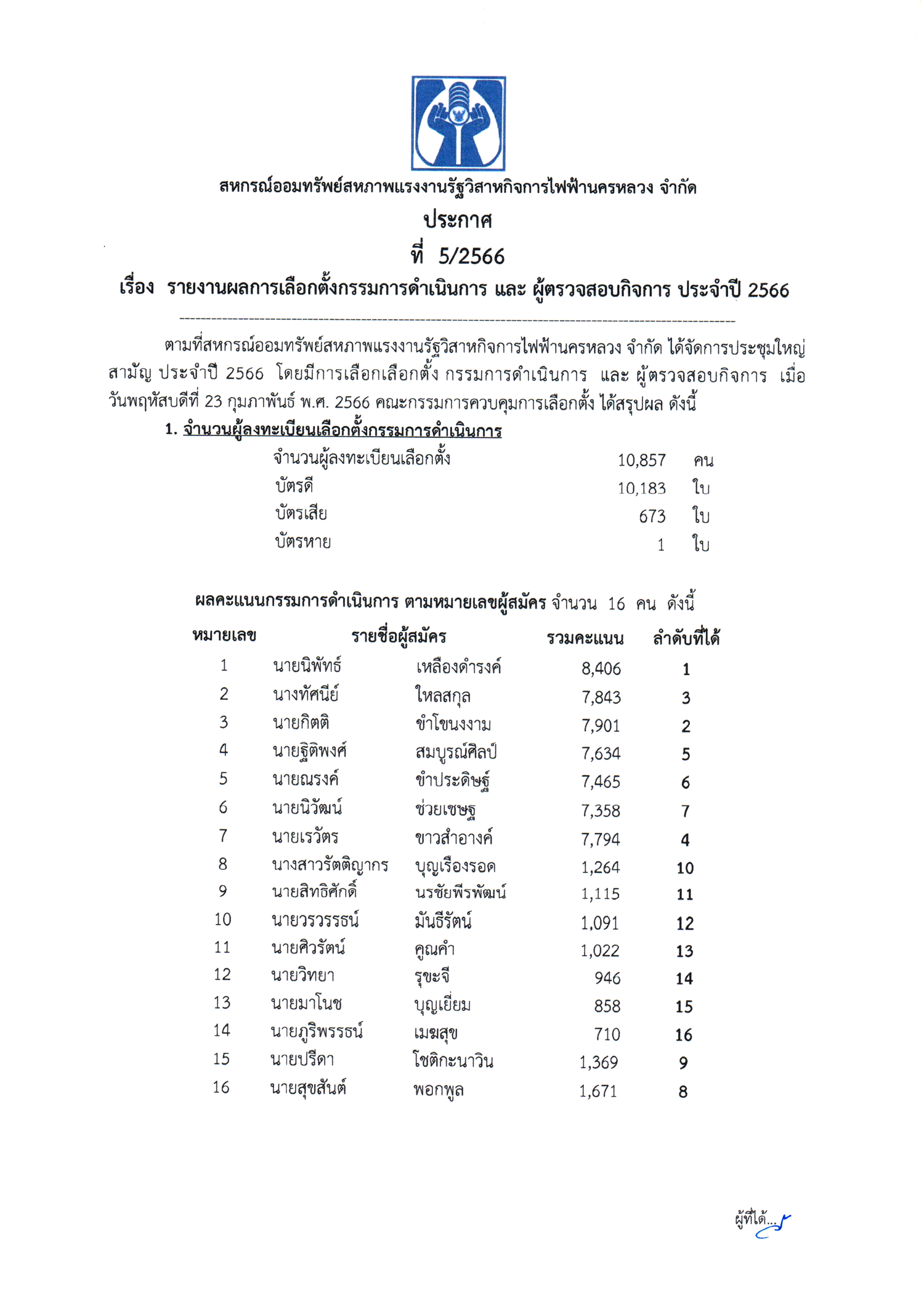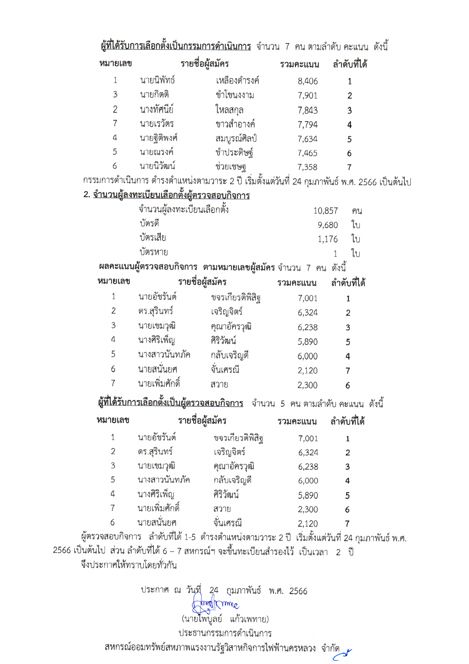 ประกาศที่ 5/2566 เรื่อง รายงานผลการเลือกตั้งกรรมการดำเนินการ และ ผู้ตรวจสอบกิจการ ประจำปี 2566