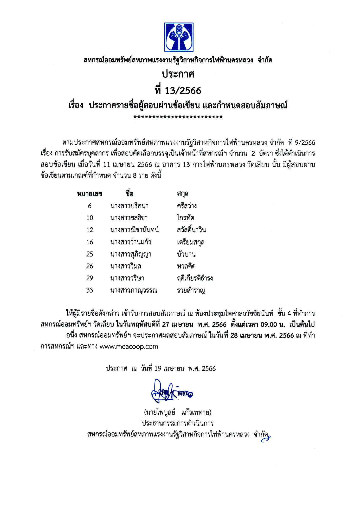• ประกาศที่ 13/2566 เรื่อง ประกาศรายชื่อผู้สอบผ่านข้อเขียน และกำหนดสอบสัมภาษณ์