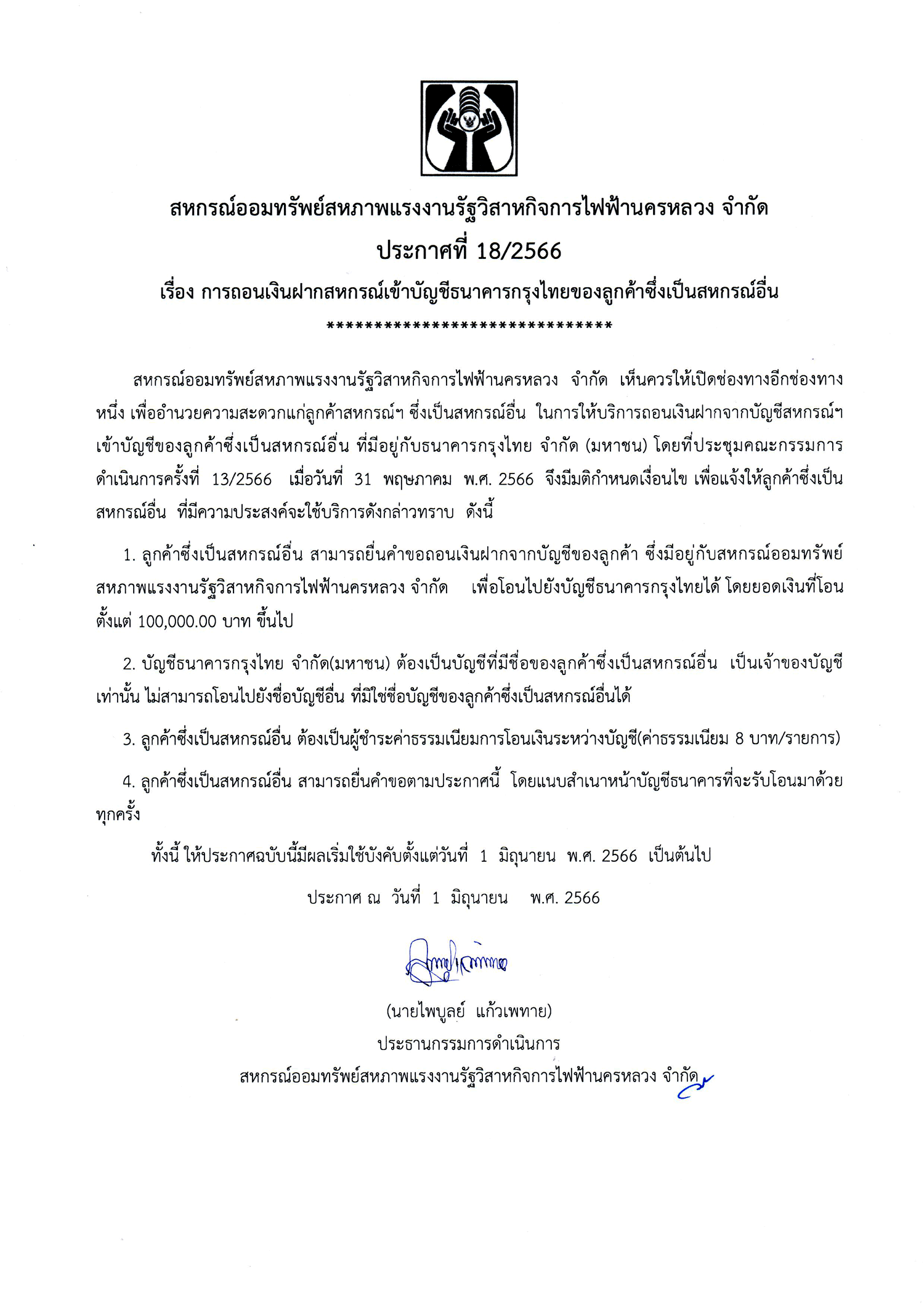 ประกาศที่ 18/2566 เรื่อง การถอนเงินฝากสหกรณ์เข้าบัญชีธนาคารกรุงไทยของลูกค้าซึ่งเป็นสหกรณ์อื่น