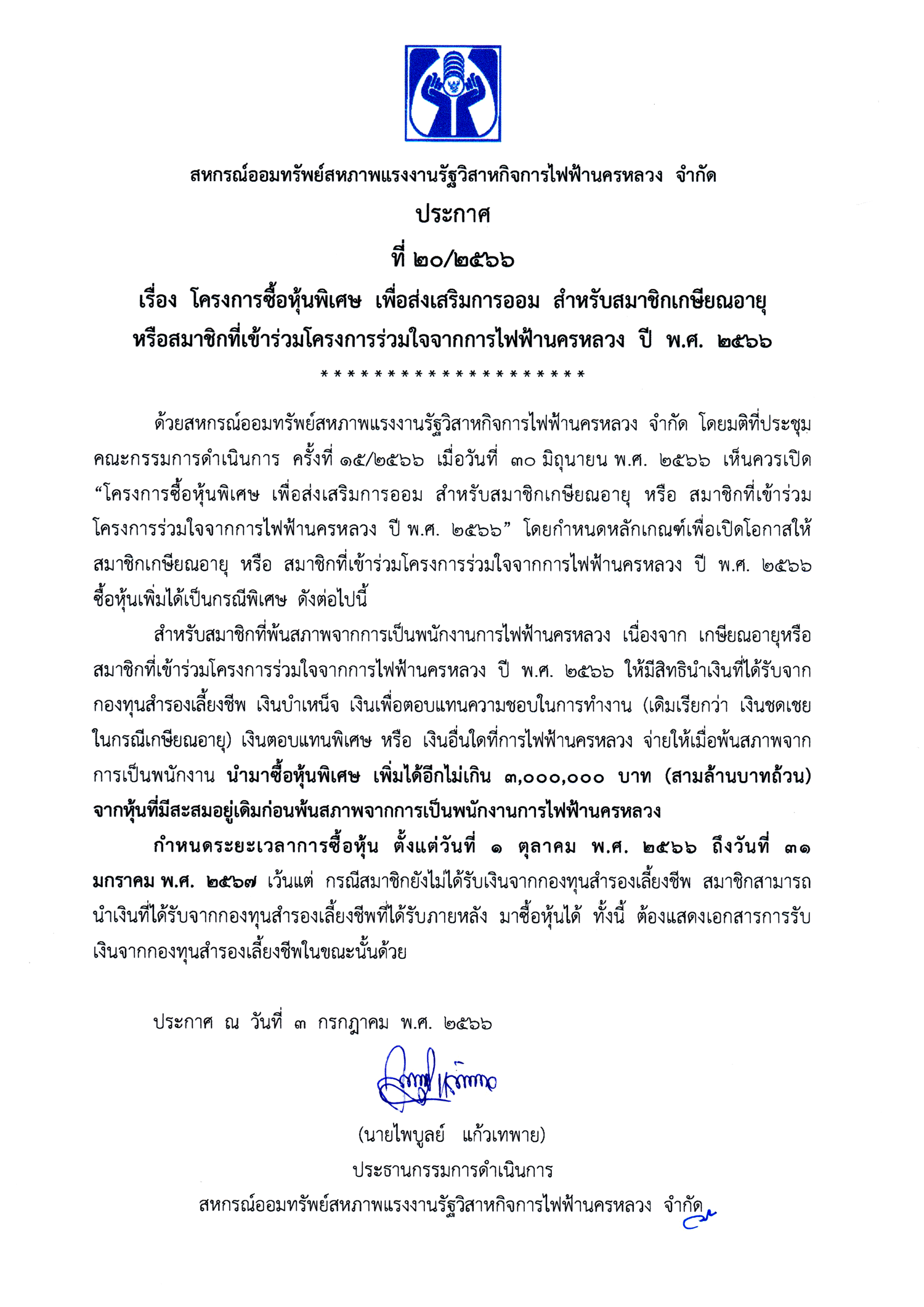ประกาศที่ 20/2566 เรื่อง โครงการซื้อหุ้นพิเศษ เพื่อส่งเสริมการออม สำหรับสมาชิกเกษียณอายุ หรือสมาชิกที่เข้าร่วมโครงการร่วมใจจากการไฟฟ้านครหลวง ปี 2566