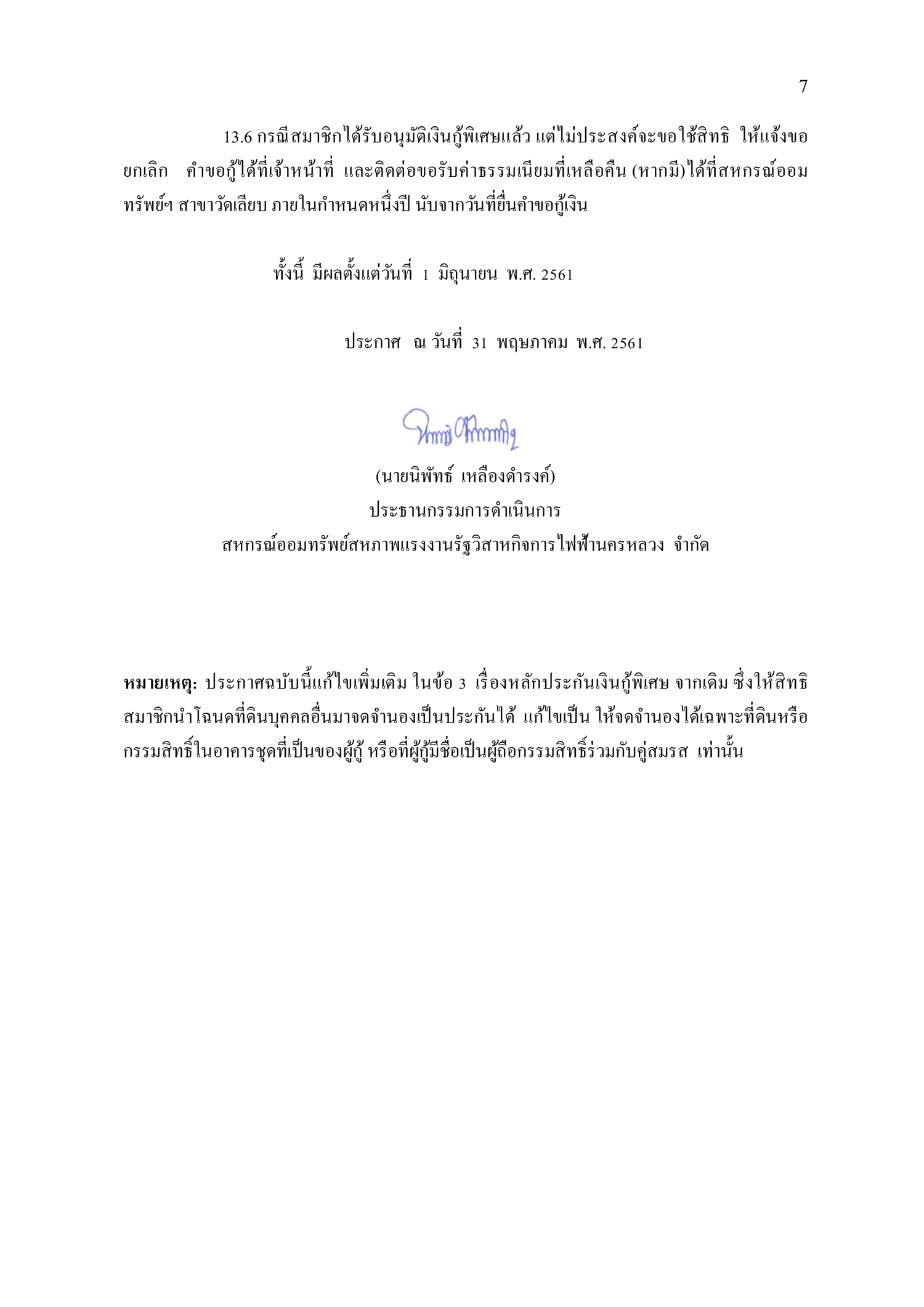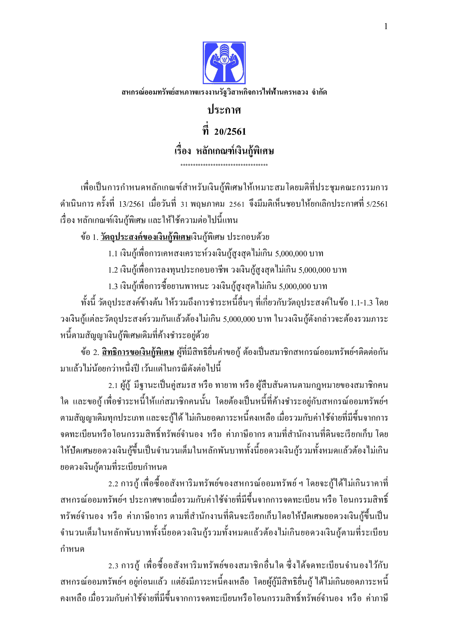 • ประกาศที่ 20/2561 เรื่อง หลักเกณฑ์เงินกู้พิเศษ