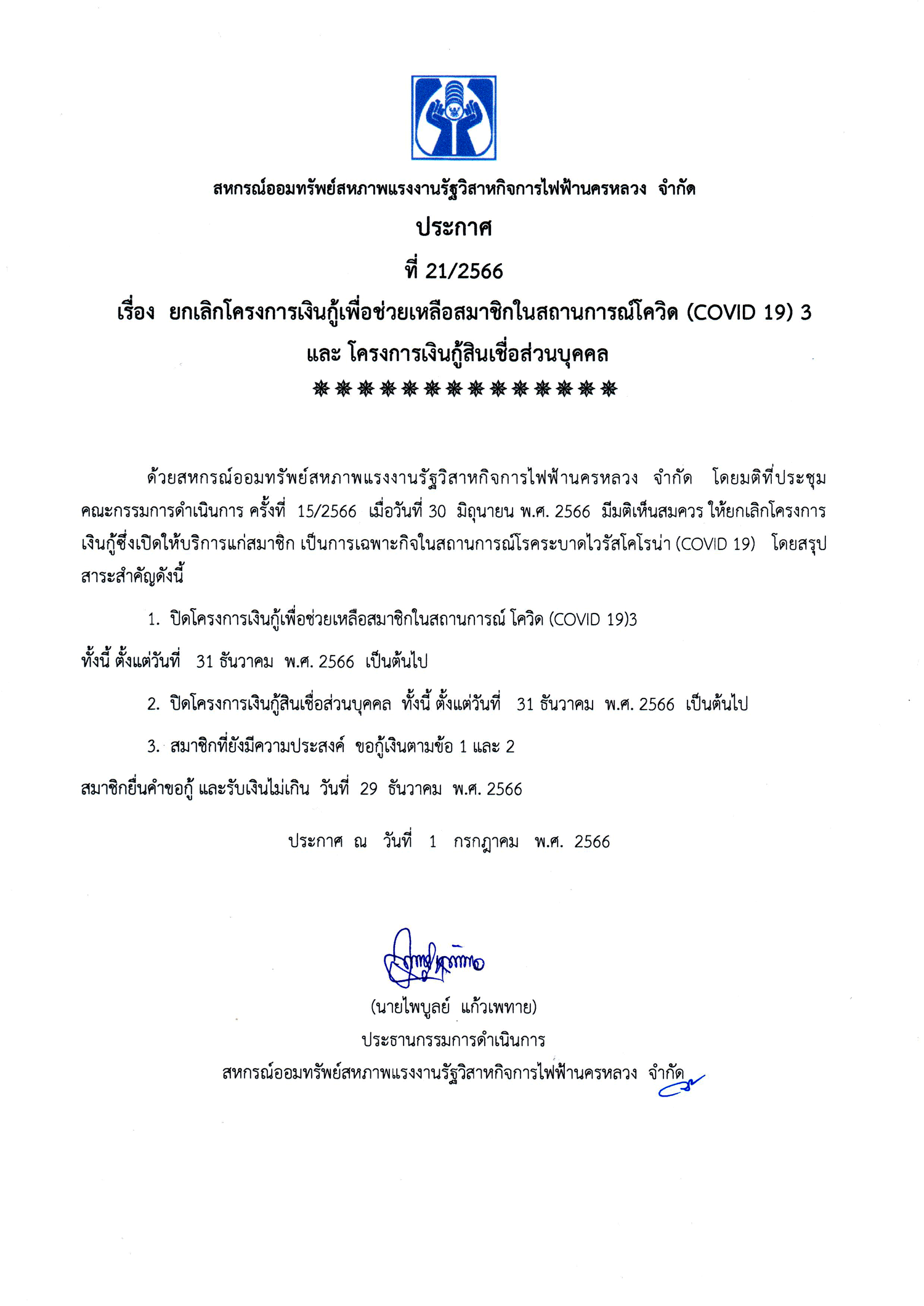ประกาศที่ 21/2566 เรื่อง ยกเลิกโครงการเงินกู้เพื่อช่วยเหลือสมาชิกในสถานการณ์โควิด (COVID 19) 3 และโครงการเงินกู้สินเชื่อส่วนบุคคล