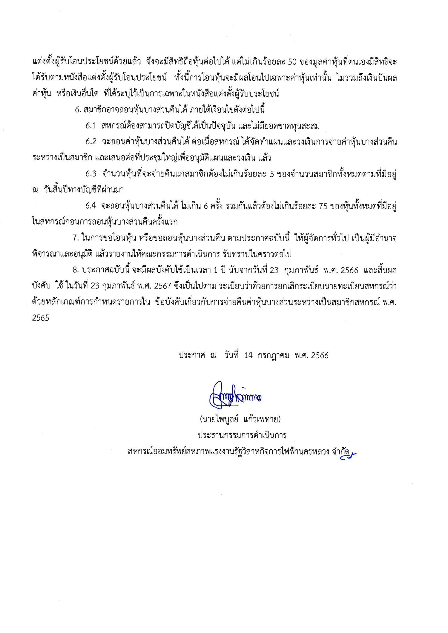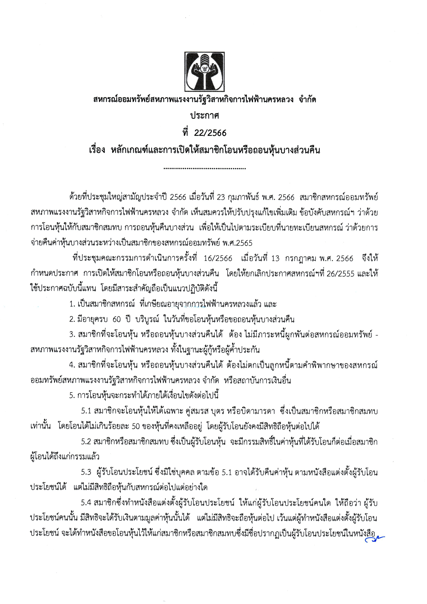 • ประกาศที่ 22/2566 เรื่อง หลักเกณฑ์และการเปิดให้สมาชิกโอนหรือถอนหุ้นบางส่วนคืน