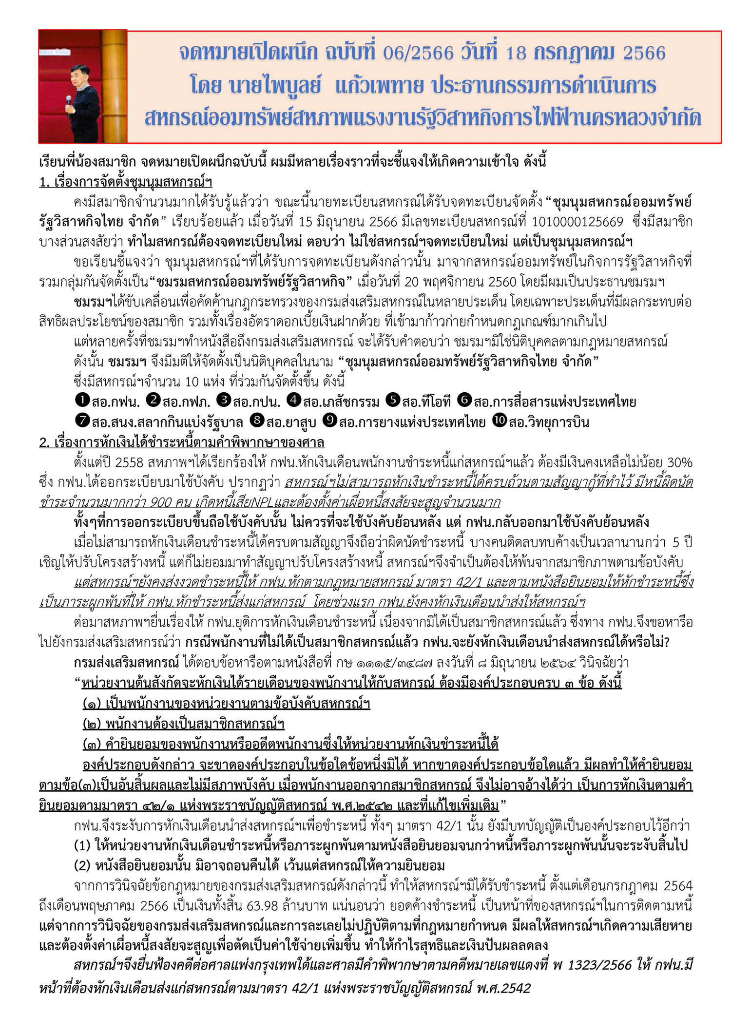 จดหมายเปิดผนึก ฉบับที่ 6/2566 วันที่ 18 กรกฎาคม 2566