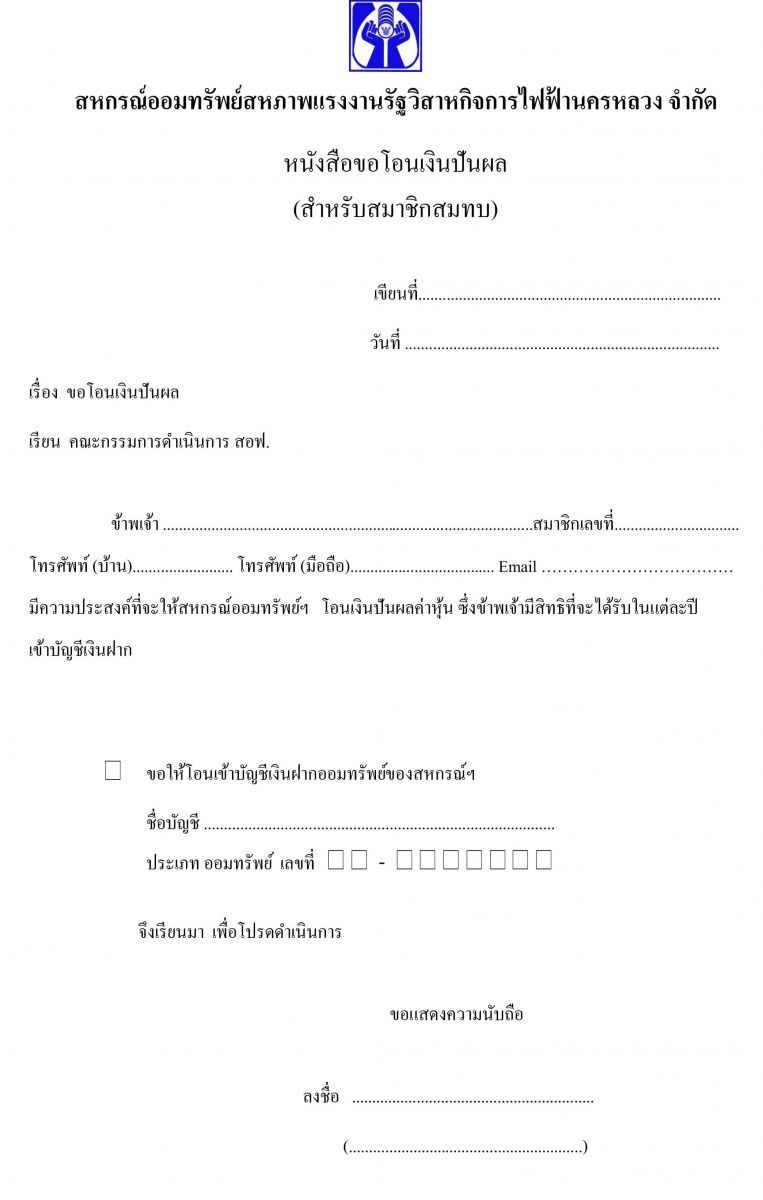 - หนังสือขอโอนเงินปันผล (สำหรับสมาชิกสมทบ)