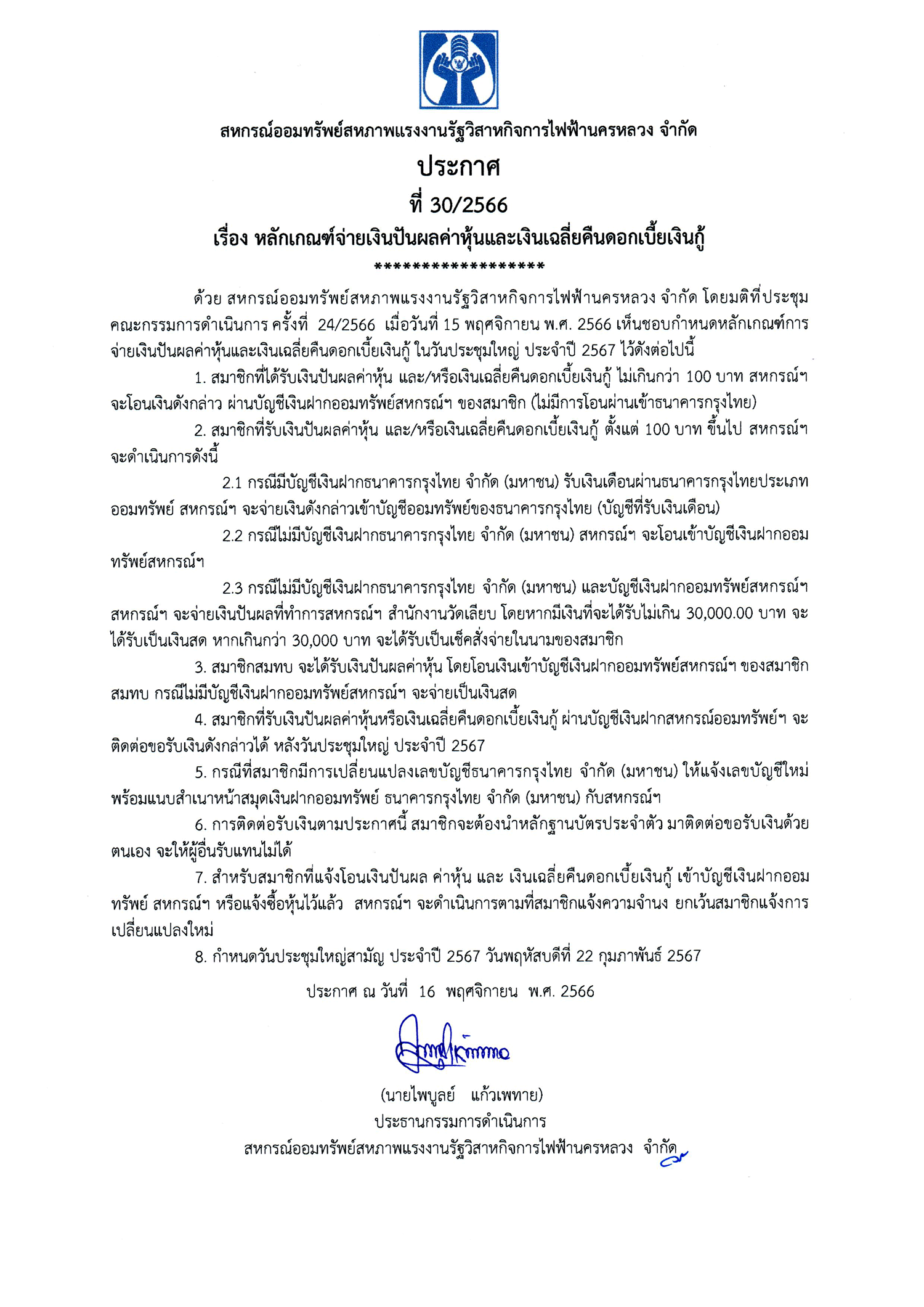 • ประกาศที่ 30/2566 เรื่อง หลักเกณฑ์จ่ายเงินปันผลค่าหุ้นและเงินเฉลี่ยคืนดอกเบี้ยเงินกู้