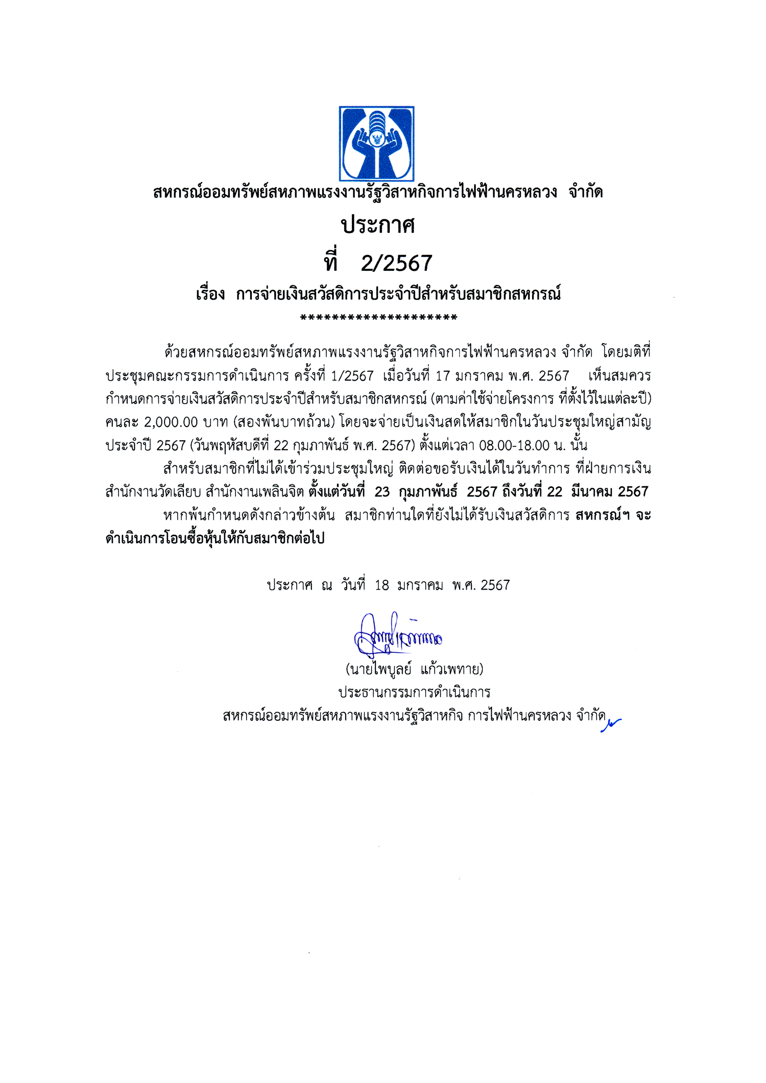 • ประกาศที่ 2/2567 เรื่องการจ่ายเงินสวัสดิการประจำปีสำหรับสมาชิกสหกรณ์