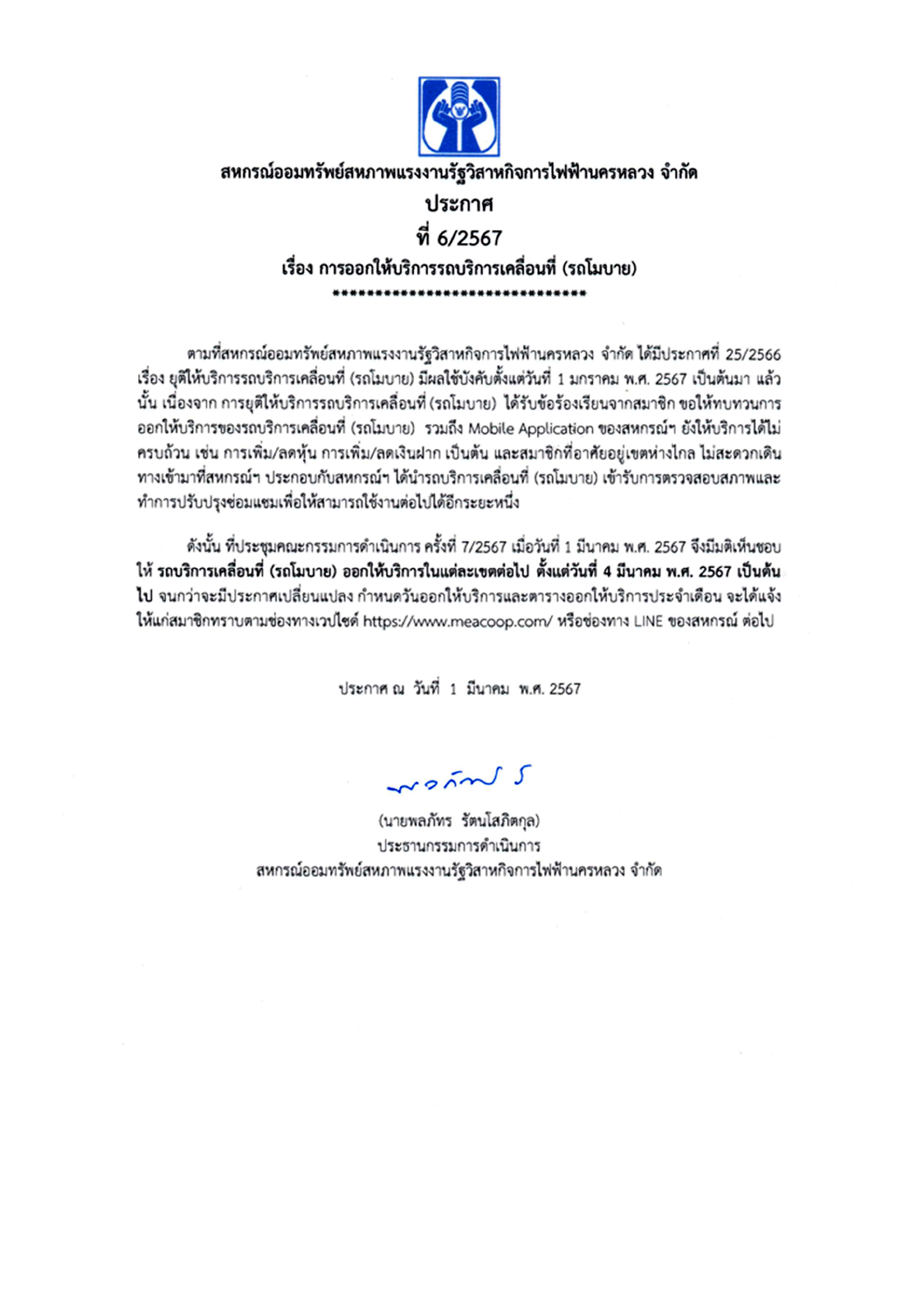 • ประกาศที่ 6/2567 เรื่อง การออกให้บริการรถบริการเคลื่อนที่