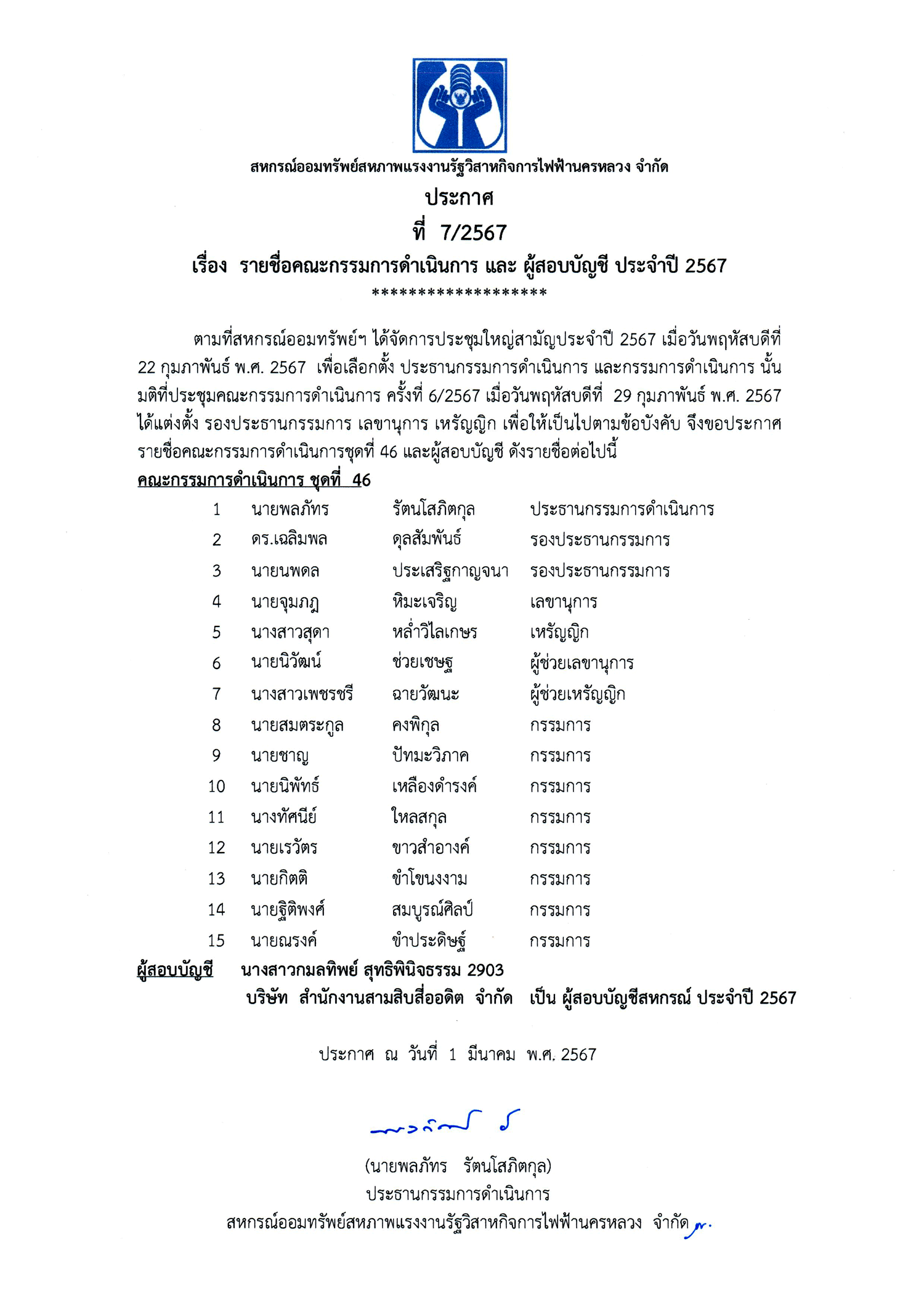 • ประกาศที่ 7/2567 เรื่อง รายชื่อคณะกรรมการดำเนินการ และ ผู้สอบบัญชี ประจำปี 2567