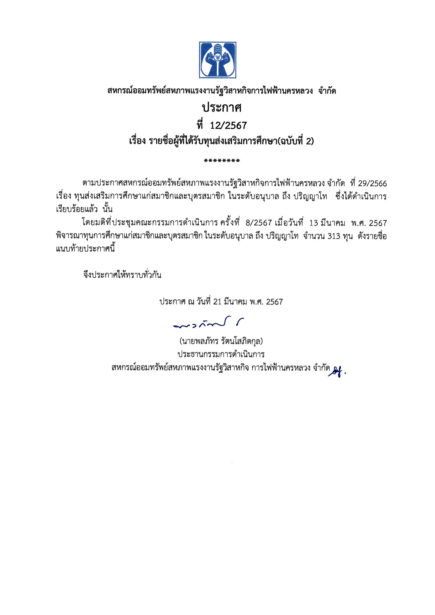 • ประกาศที่ 12/2567 เรื่อง รายชื่อผู้ได้รับทุนส่งเสริมการศึกษา(ฉบับที่ 2)