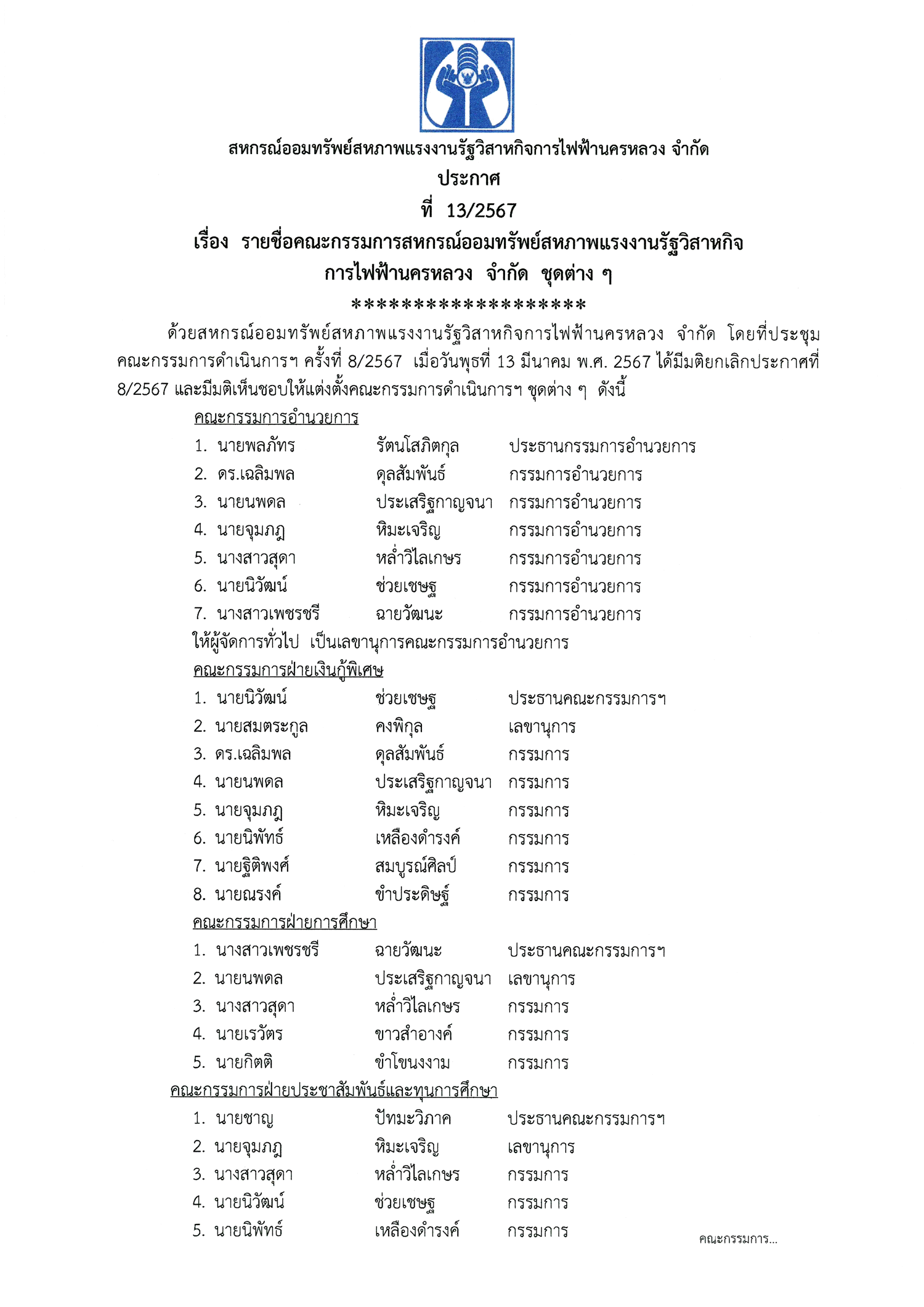 ประกาศที่ 13/2567 เรื่อง รายชื่อคณะกรรมการสหกรณ์ออมทรัพย์สหภาพแรงงานรัฐวิสาหกิจการไฟฟ้านครหลวง จำกัด ชุดต่าง ๆ