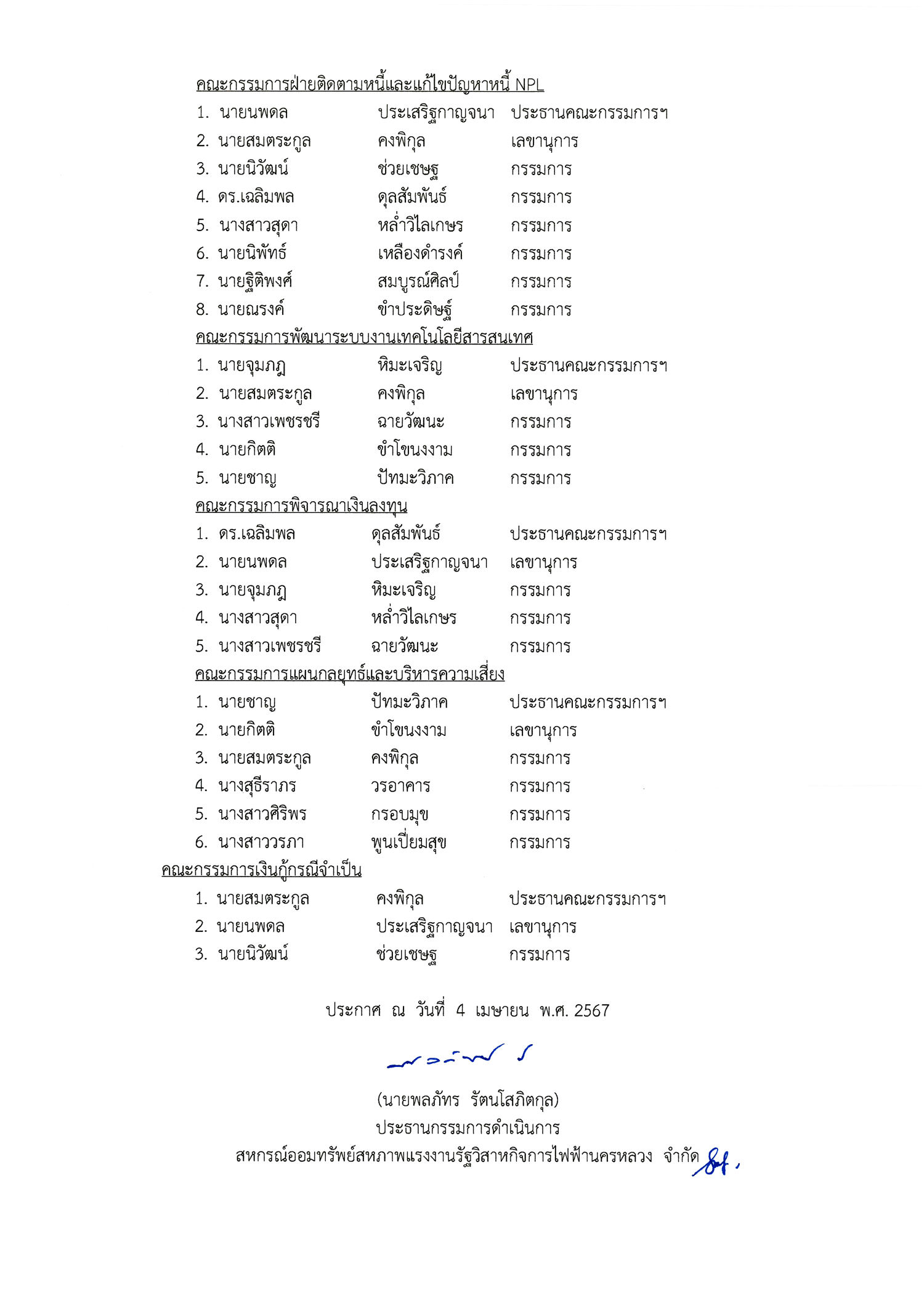 • ประกาศที่ 13/2567 เรื่อง รายชื่อคณะกรรมการสหกรณ์ออมทรัพย์สหภาพแรงงานรัฐวิสาหกิจการไฟฟ้านครหลวง จำกัด ชุดต่าง ๆ