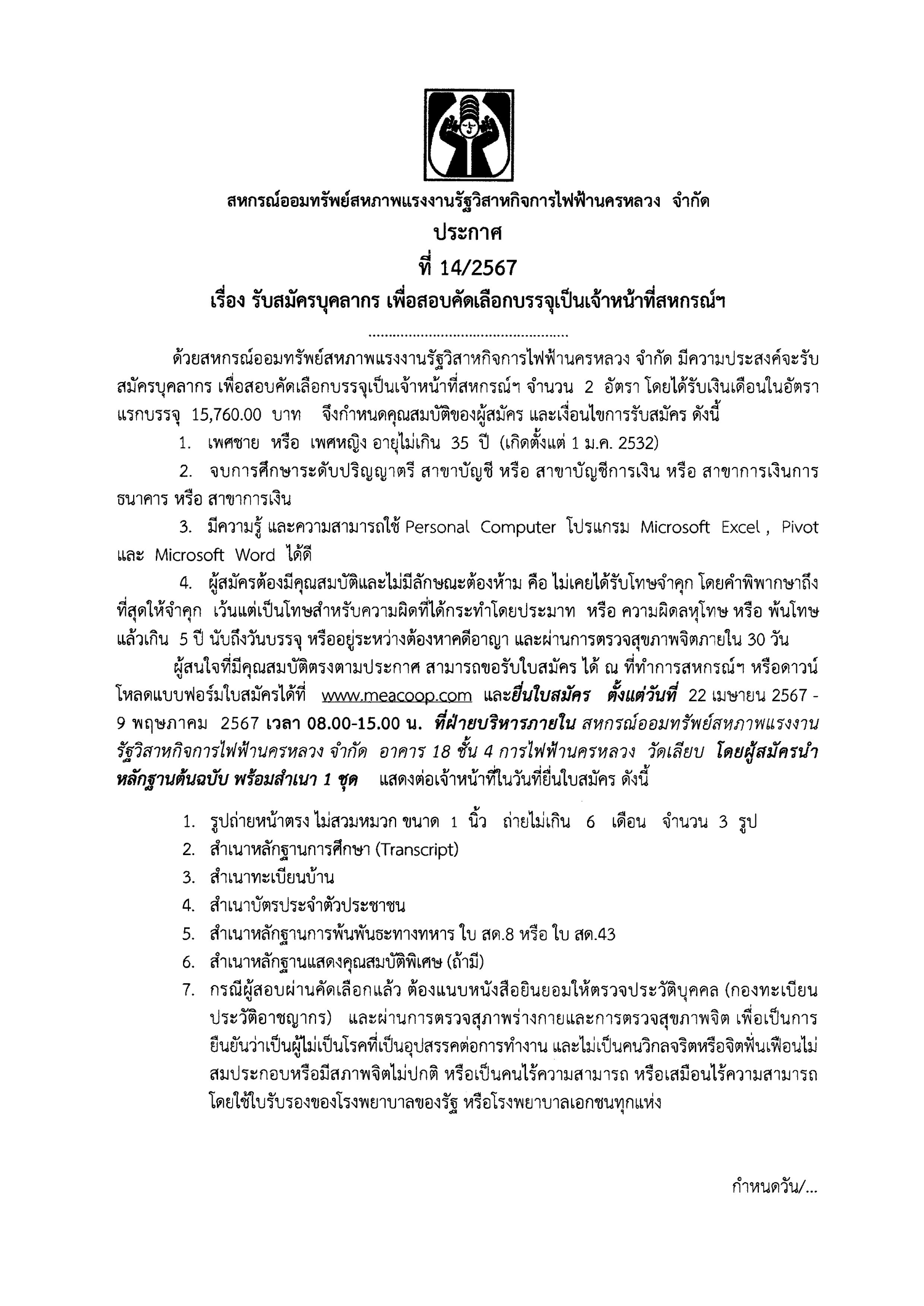 • ประกาศที่ 14/2567 เรื่อง รับสมัครบุคลากร เพื่อสอบคัดเลือกบรรจุเป็นเจ้าหน้าที่สหกรณ์ฯ