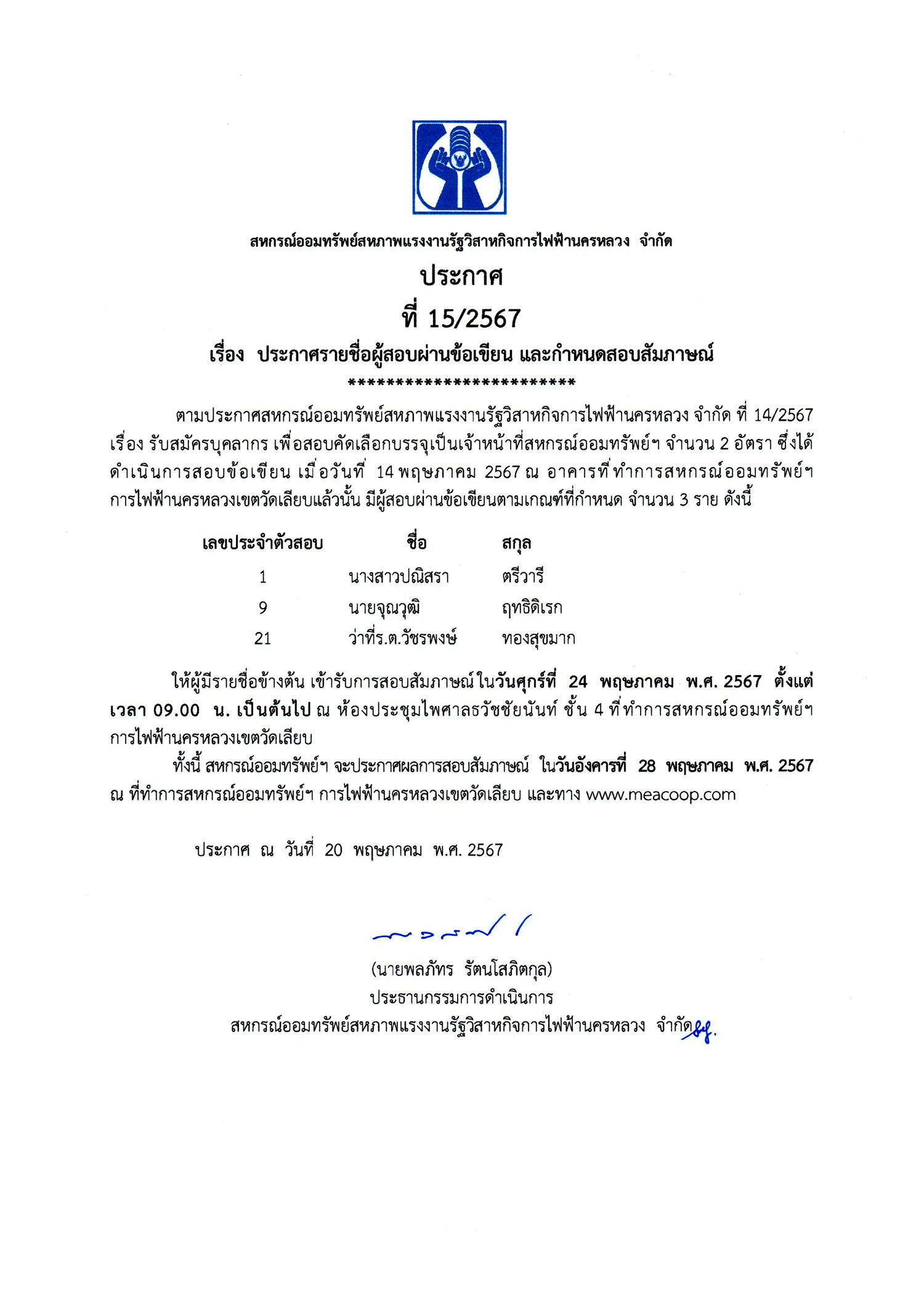 • ประกาศที่ 15/2567 เรื่อง ประกาศรายชื่อผู้สอบผ่านข้อเขียน และกำหนดสอบสัมภาษณ์