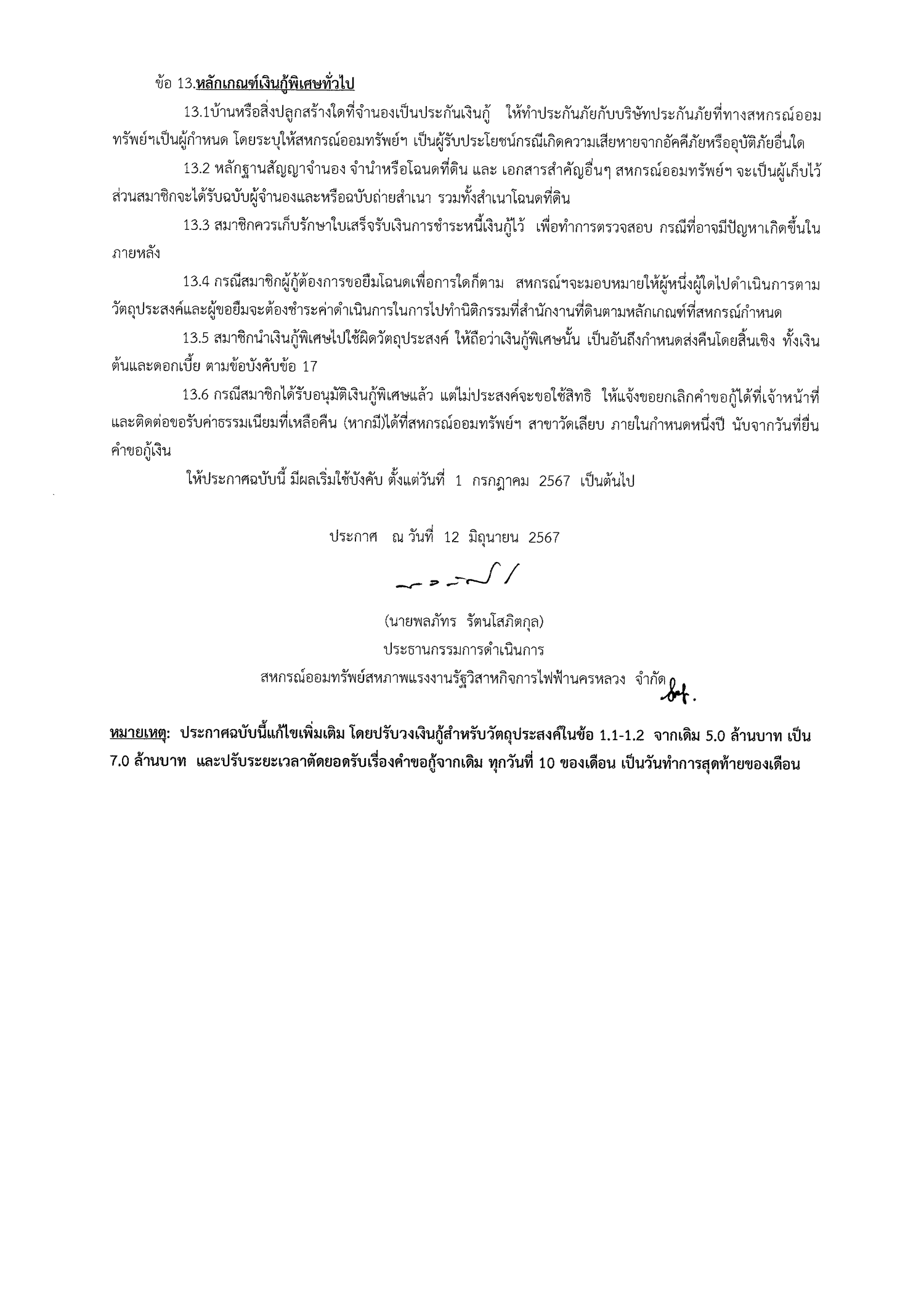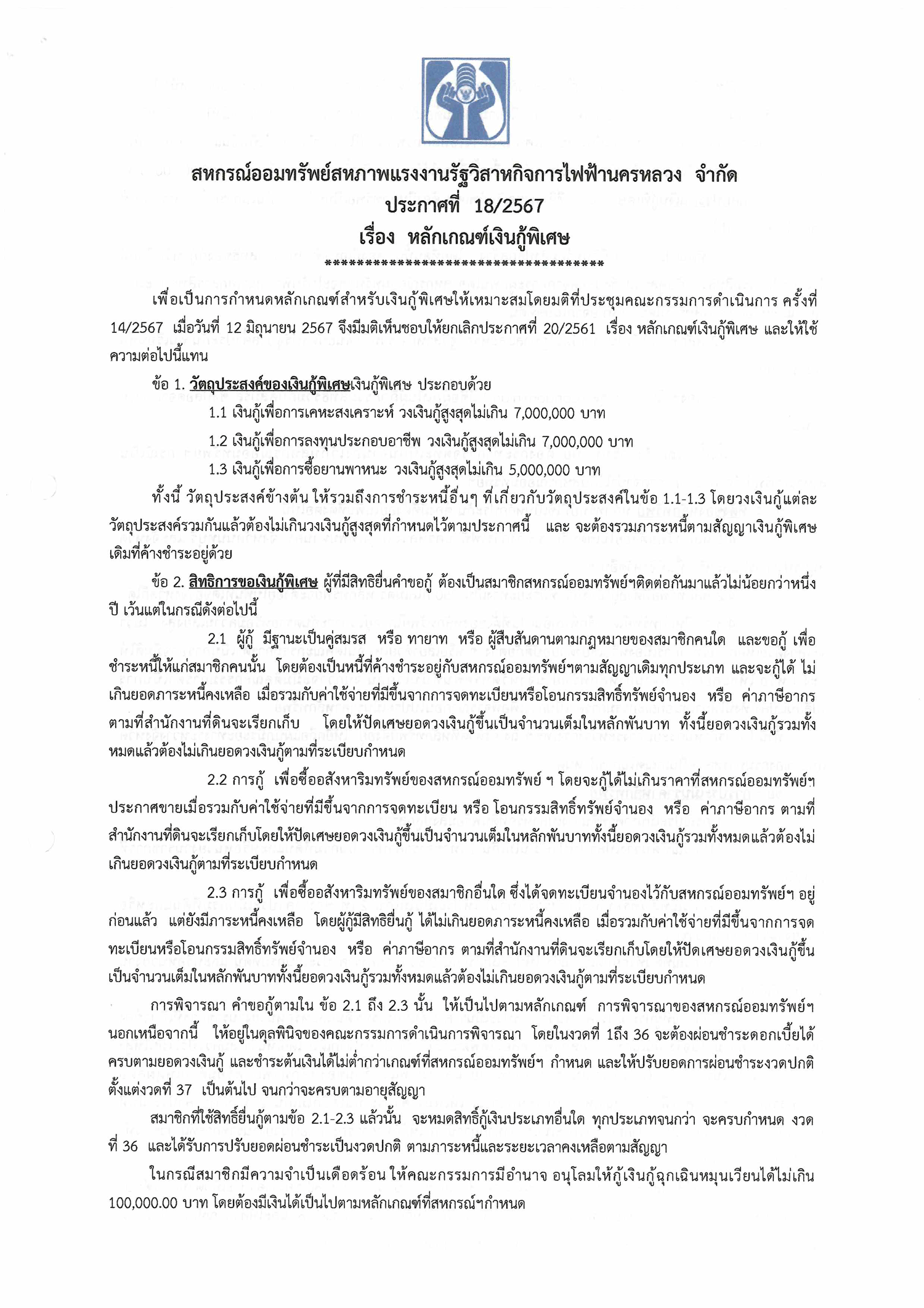 • ประกาศที่ 18/2567 เรื่อง หลักเกณฑ์เงินกู้พิเศษ