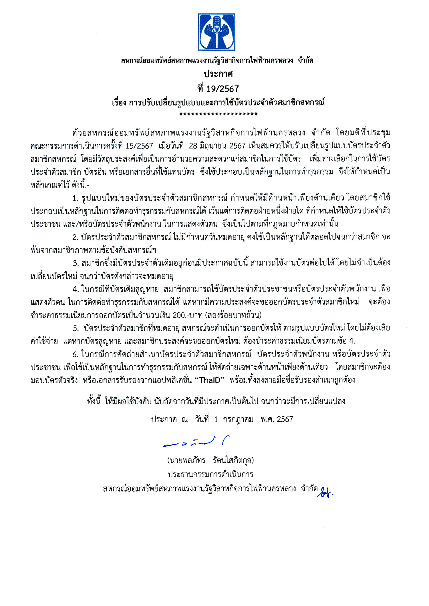 ประกาศที่ 19/2567 เรื่อง การปรับเปลี่ยนรูปแบบและการใช้บัตรประจำตัวสมาชิกสหกรณ์