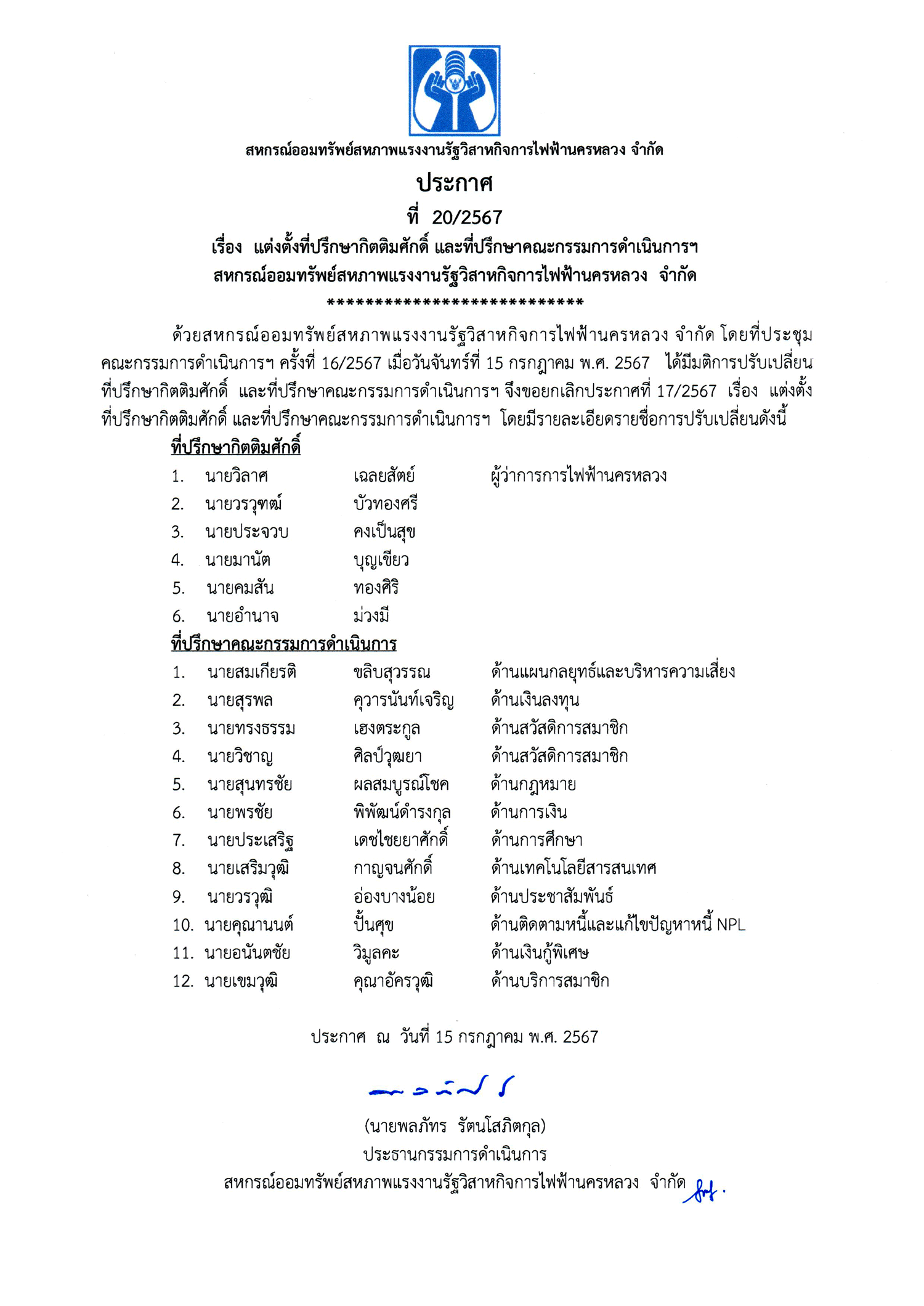 • ประกาศที่ 20/2567 เรื่อง แต่งตั้งที่ปรึกษากิตติมศักดิ์ และที่ปรึกษาคณะกรรมการดำเนินการ สหกรณ์ฯ