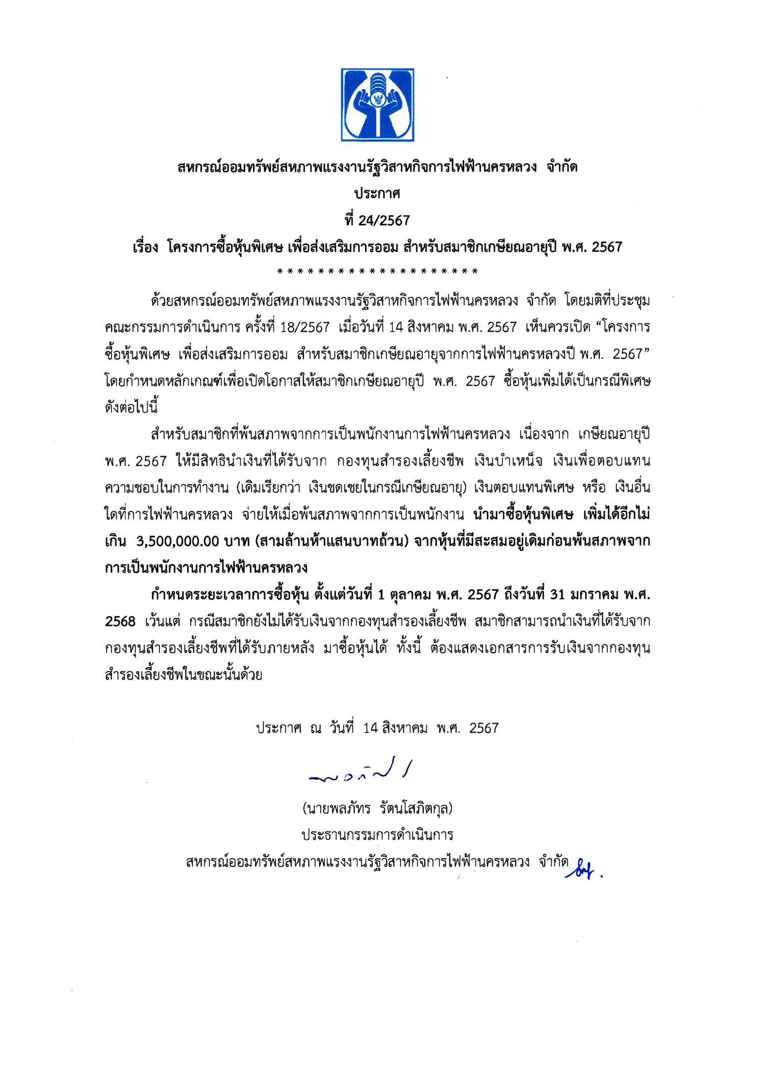 • ประกาศที่ 24/2567 เรื่อง โครงการซื้อหุ้นพิเศษ เพื่อส่งเสริมการออม สำหรับสมาชิกเกษียณอายุ ปี 2567
