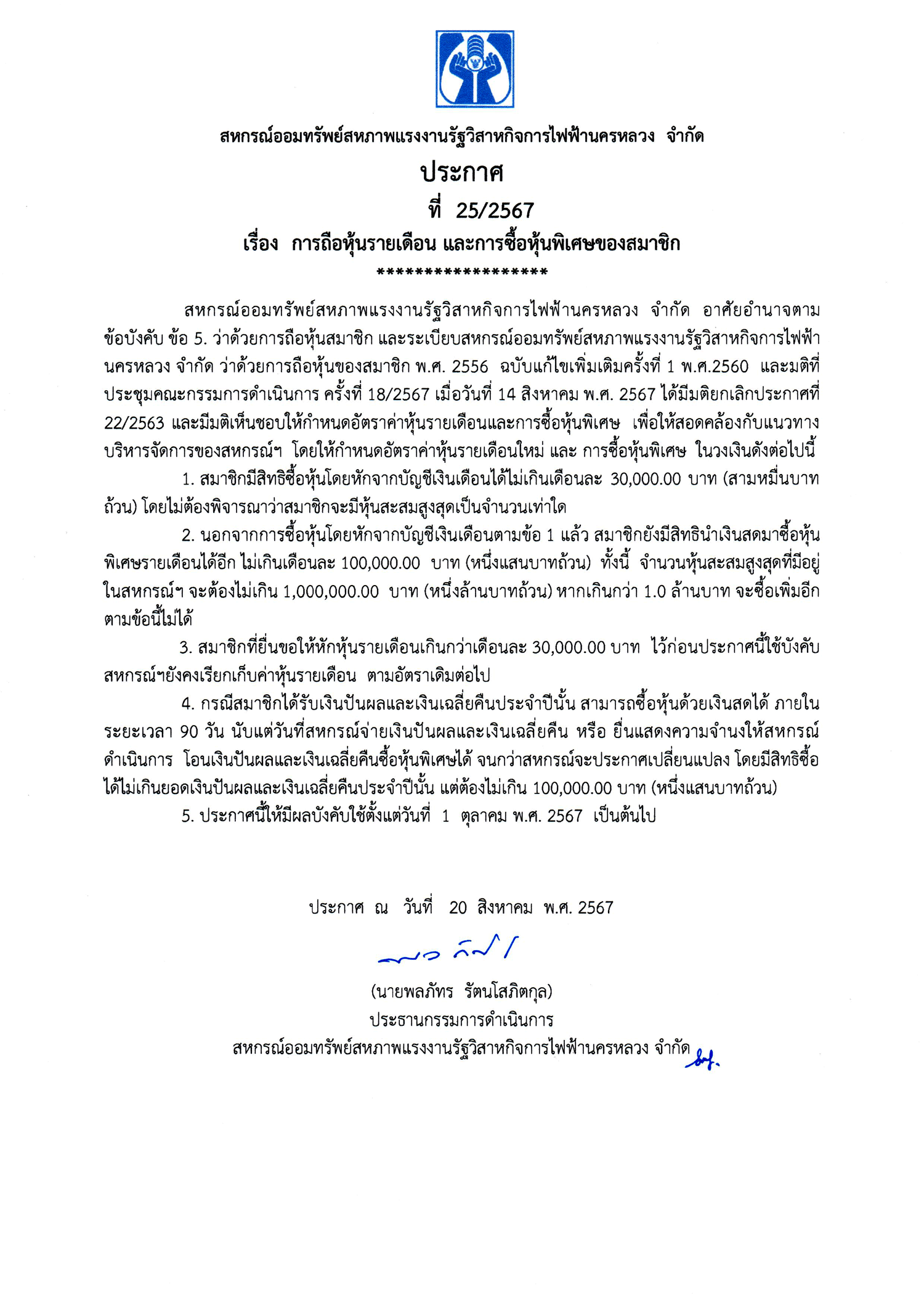 ประกาศที่ 25/2567 เรื่อง การถือหุ้นรายเดือน และการซื้อหุ้นพิเศษของสมาชิก
