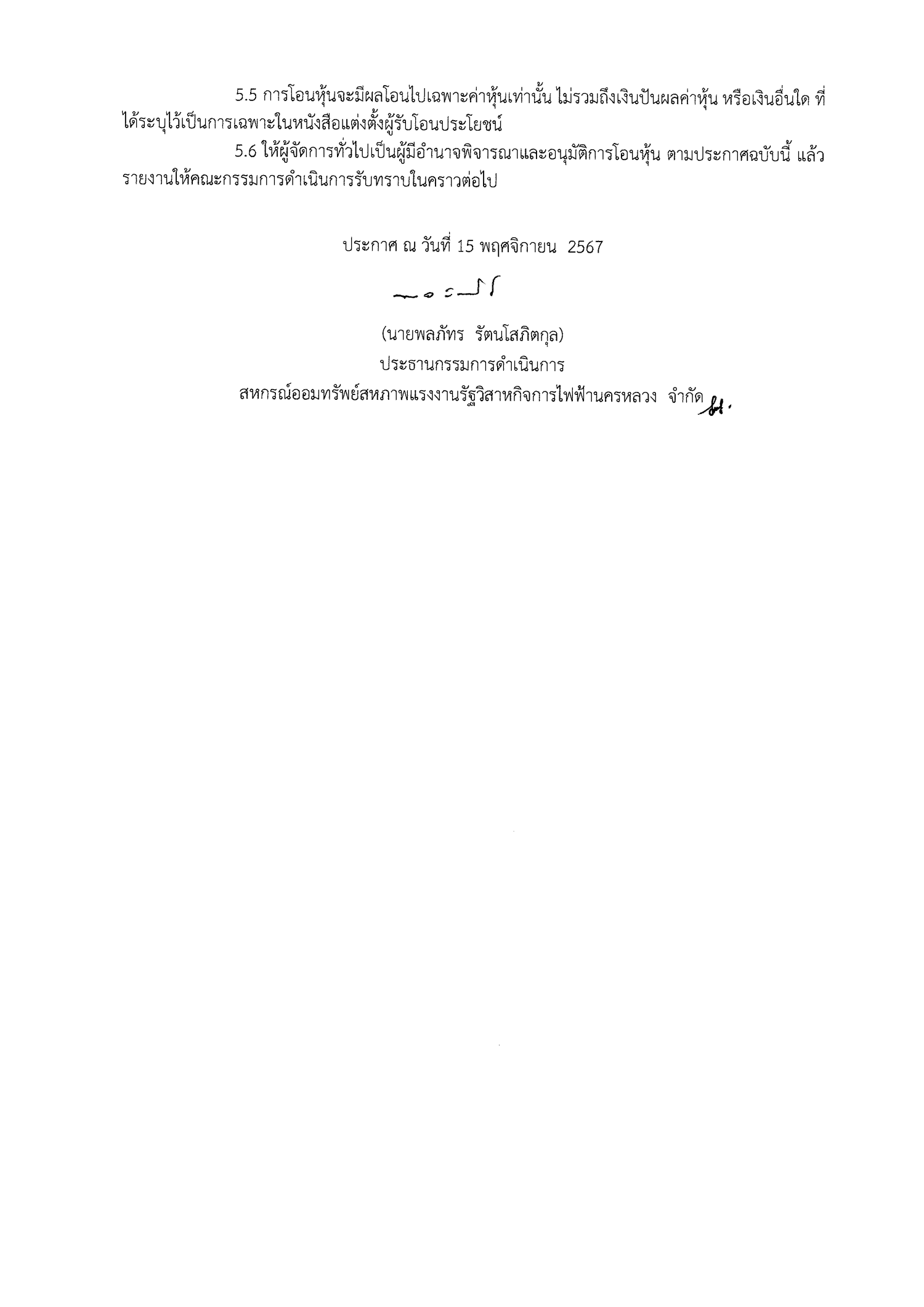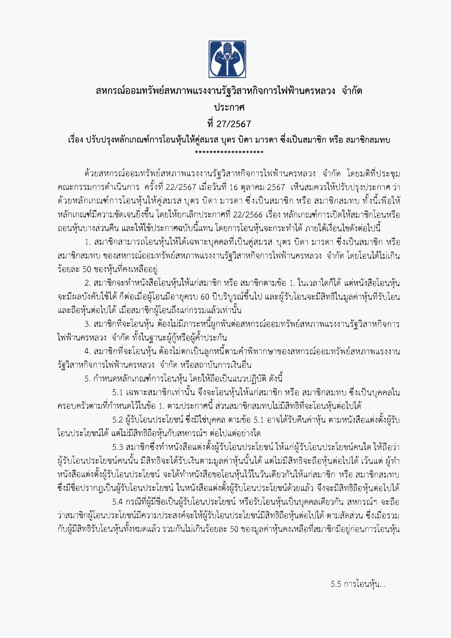 • ประกาศที่ 27/2567 เรื่อง ปรับปรุงหลักเกณฑ์การโอนหุ้นให้คู่สมรส บุตร บิดา มารดา ซึ่งเป็นสมาชิก หรือ สมาชิกสมทบ
