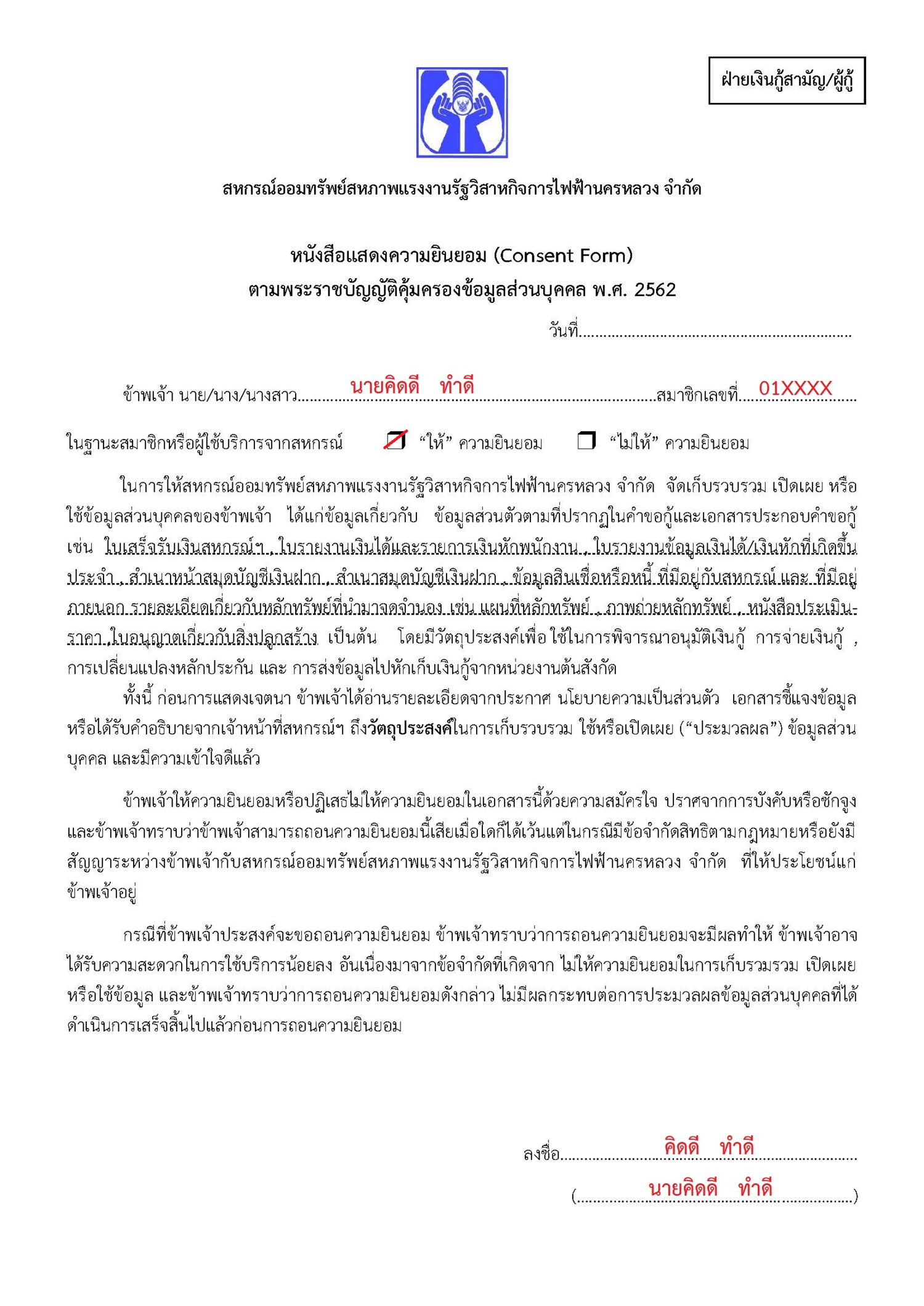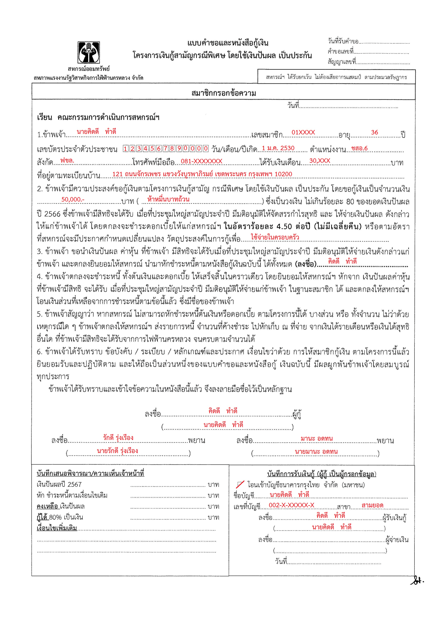 ตัวอย่างการกรอกแบบฟอร์มโครงการเงินกู้สามัญกรณีพิเศษ โดยใช้เงินปันผลเป็นประกัน