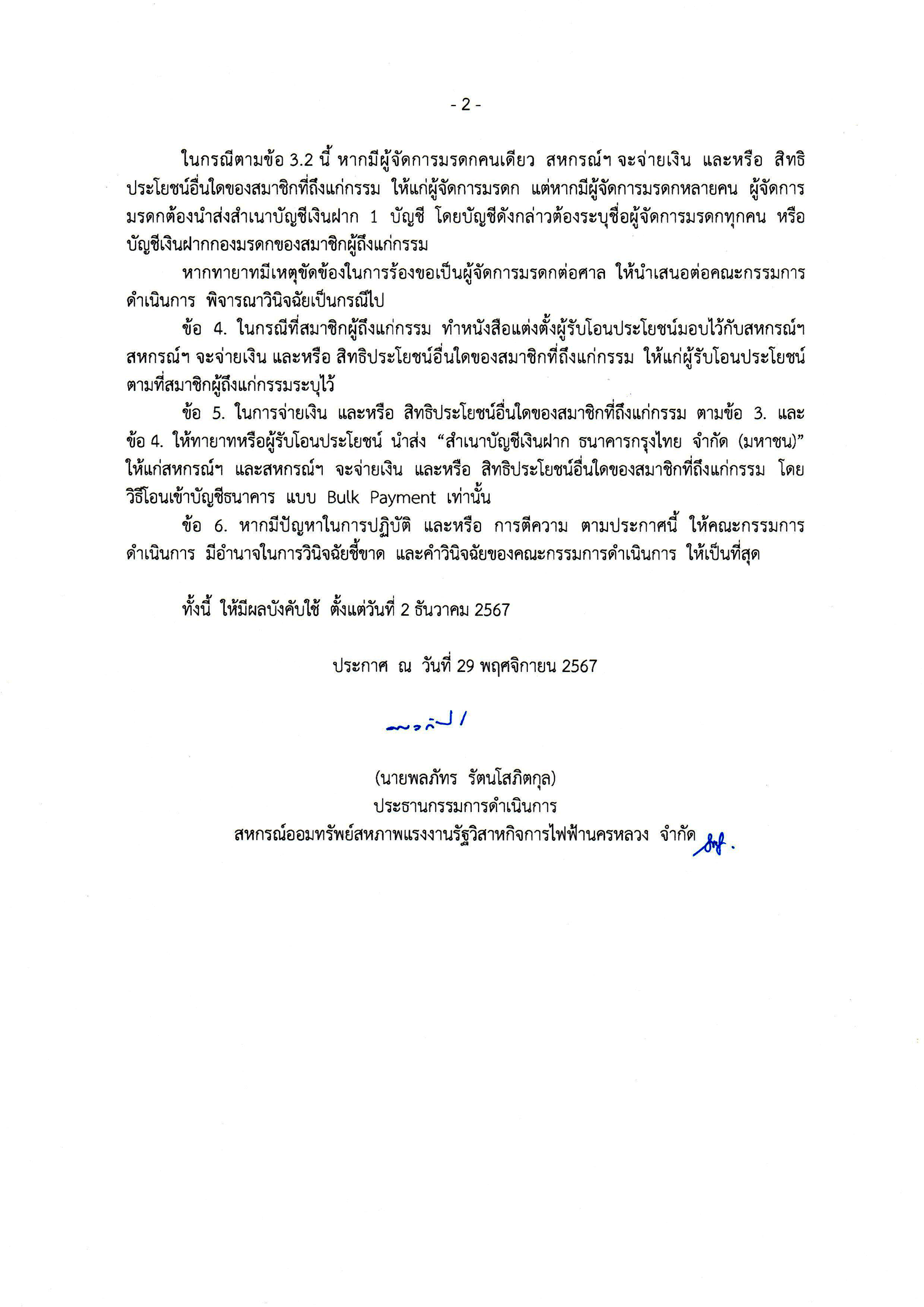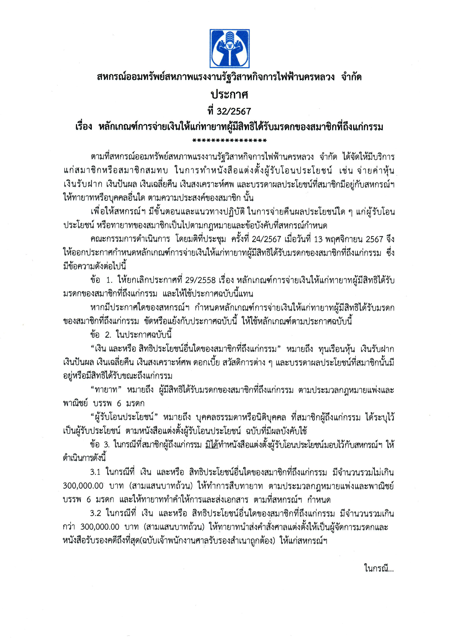 • ประกาศที่ 32/2567 เรื่อง หลักเกณฑ์การจ่ายเงินให้แก่ทายาทผู้มีสิทธิได้รับมรดกของสมาชิกที่ถึงแก่กรรม
